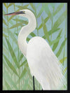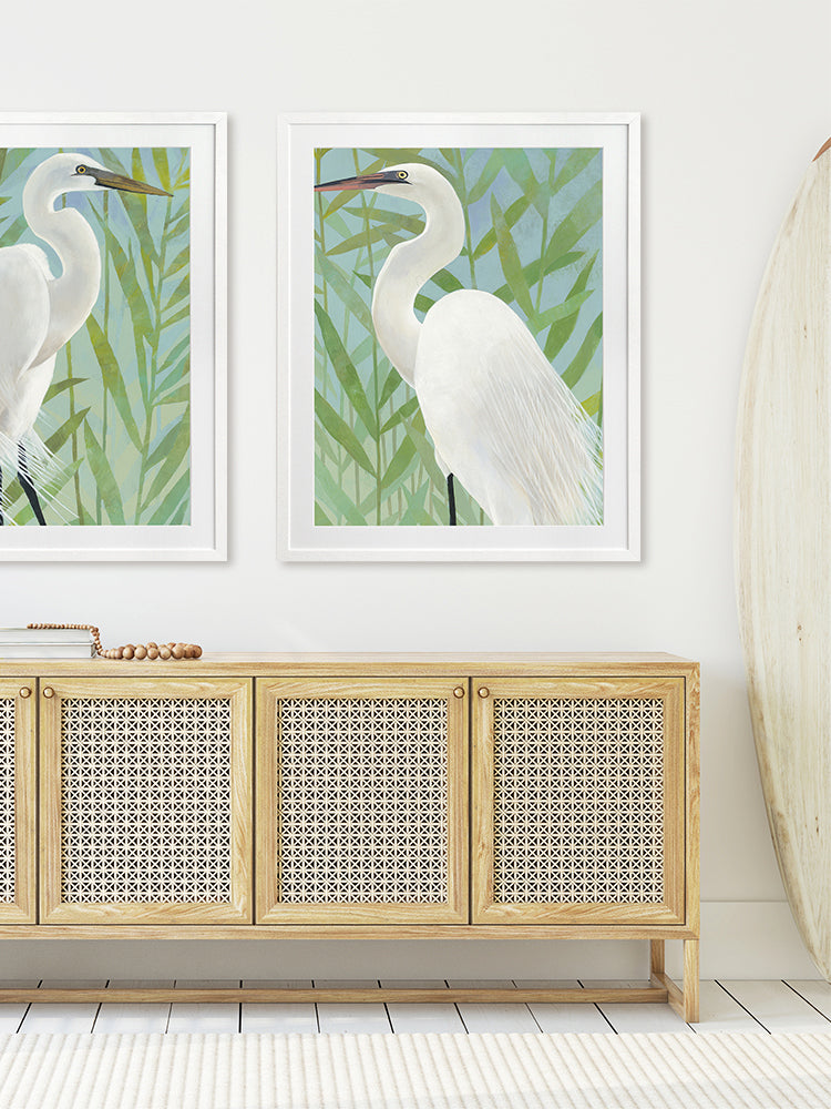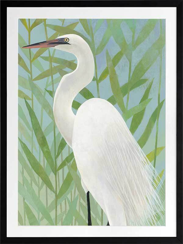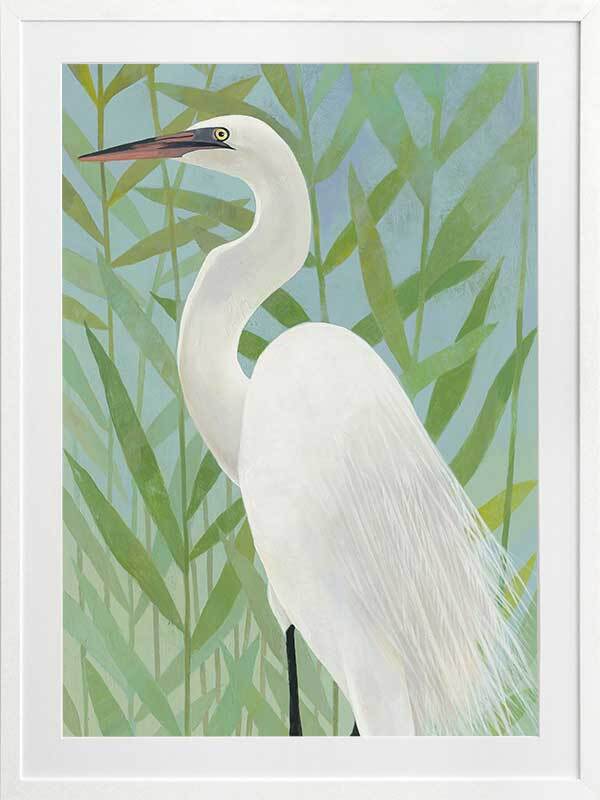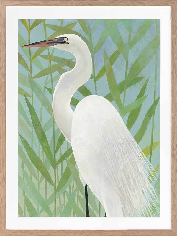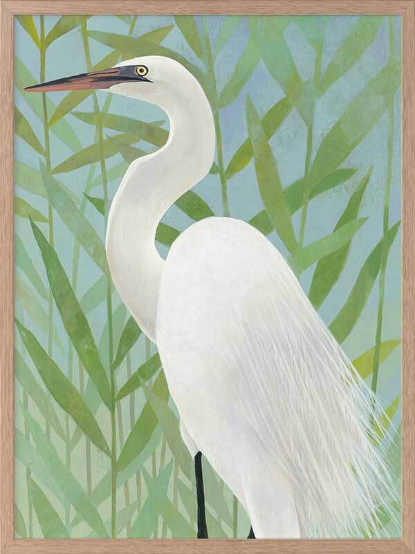 Water Bird II Framed Art Print - A fresh, coastal inspired artwork that showcases a beautiful white egret bird standing tall and proud against a background of green leaves and a soft sky fading from blue to yellow. Pairs with Water Bird I.