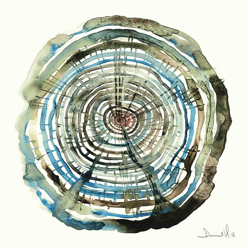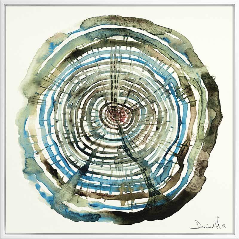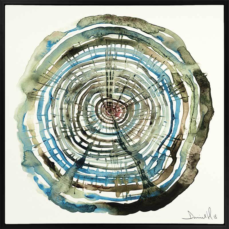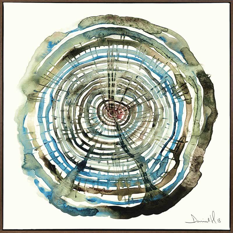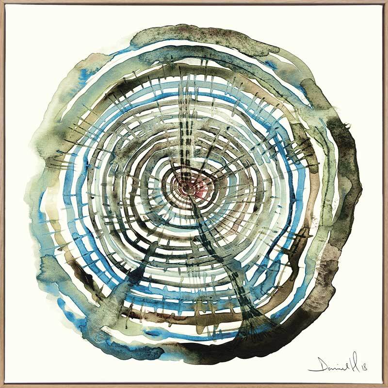 Water Oak Canvas Art Print - You'll feel hypnotised to fall in love with this piece! A bold art print that includes a spiral of blue, green, and brown watercolour shades on a warm yellow.