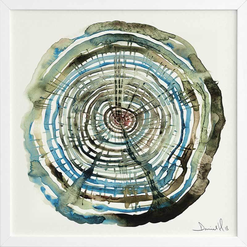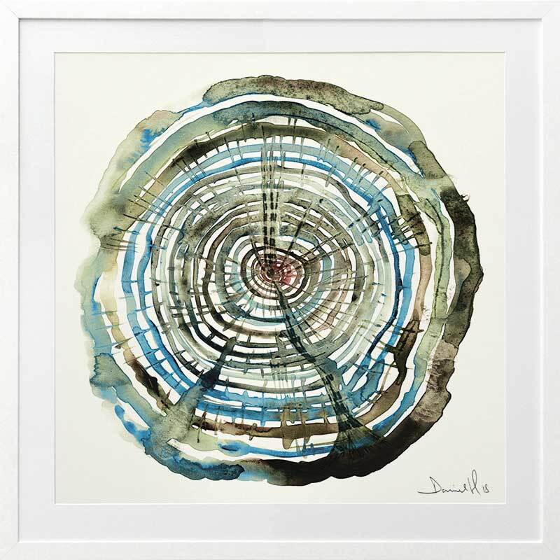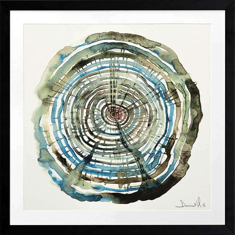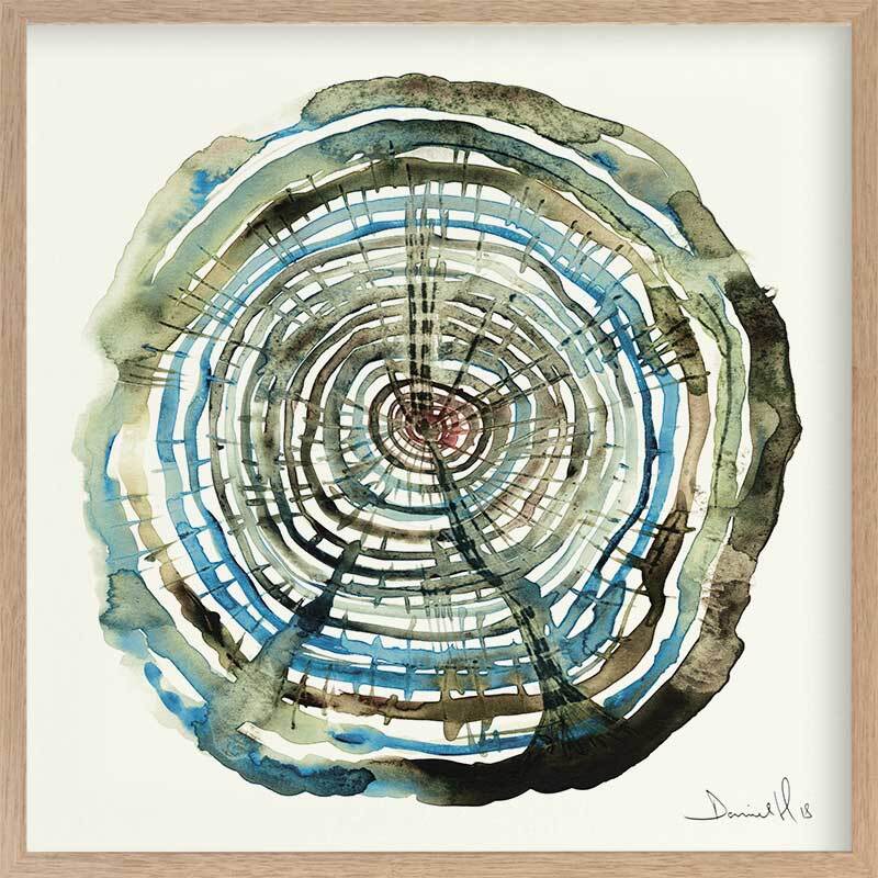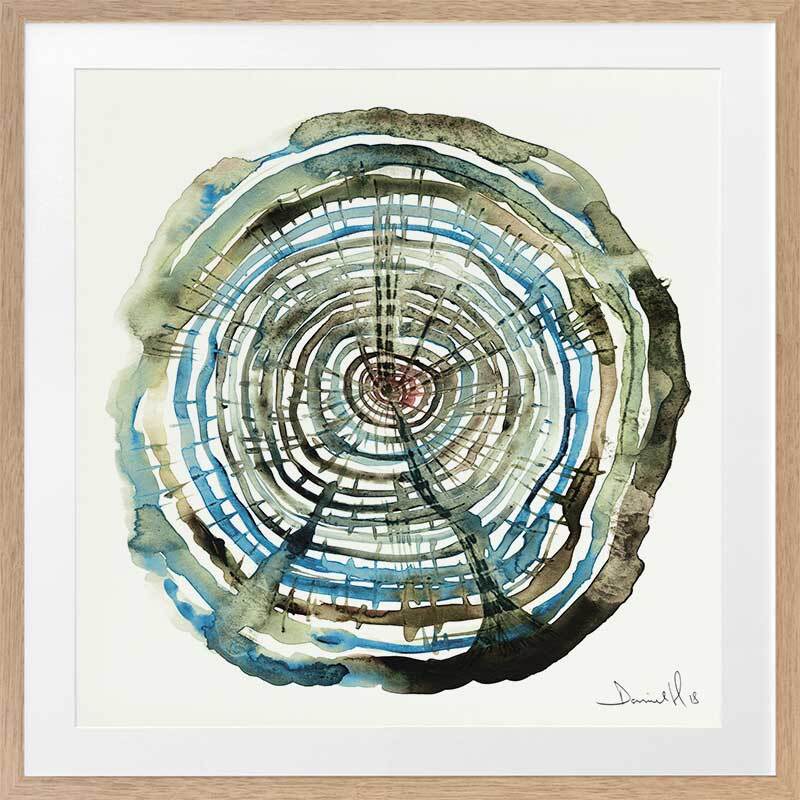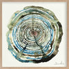 Water Oak Framed Art Print - You'll feel hypnotised to fall in love with this piece! A bold art print that includes a spiral of blue, green, and brown watercolour shades on a warm yellow.
