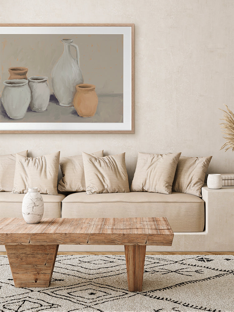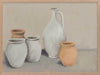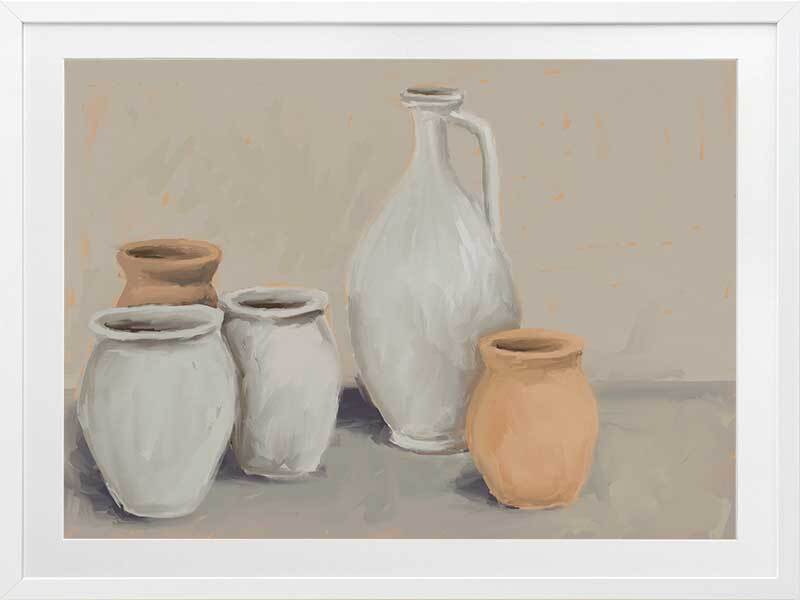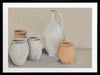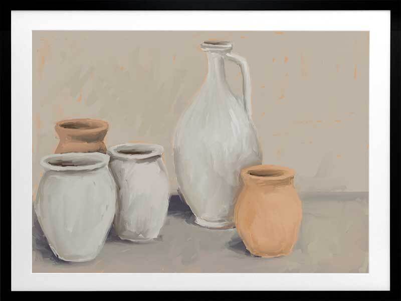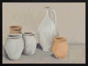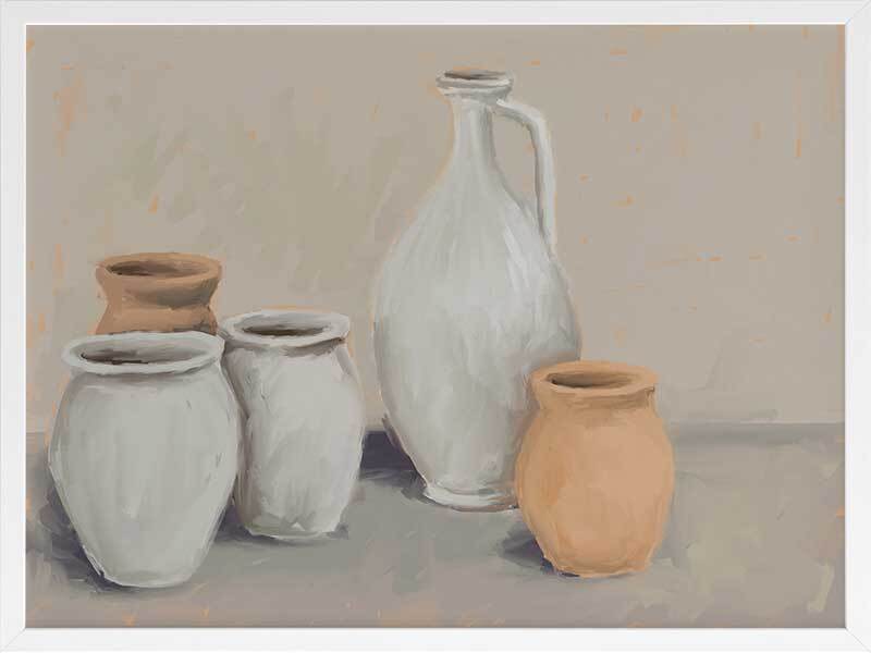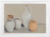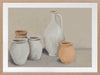 Water of Life Framed Art Print - This painterly artwork features clay jars together with a water jug. The colour palette of grey tones from the jug and two jars contrasts with the beige tones of another two jars. The group of clay jars and jug is set amidst a grey background.