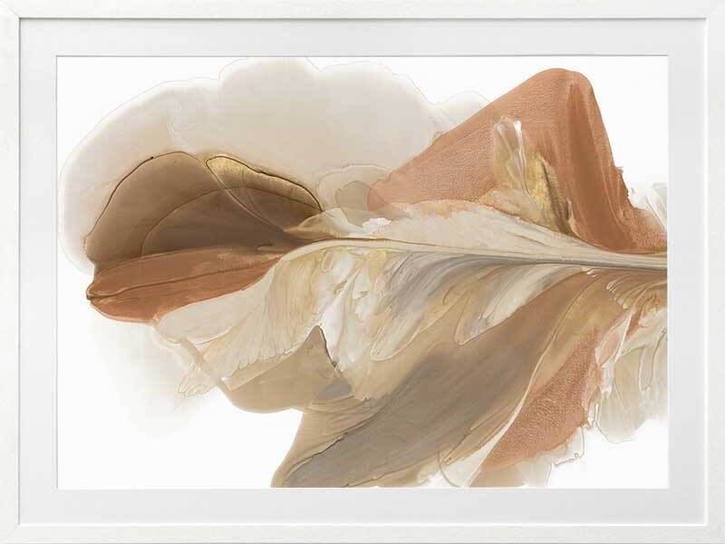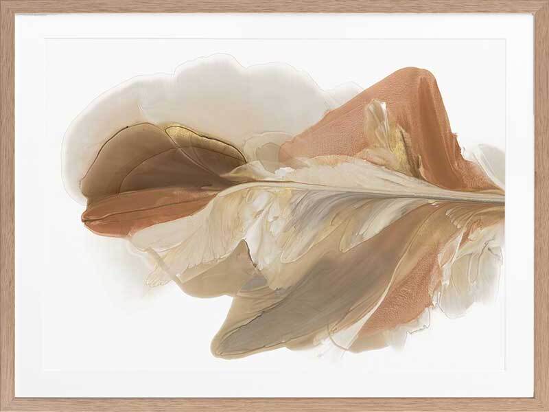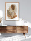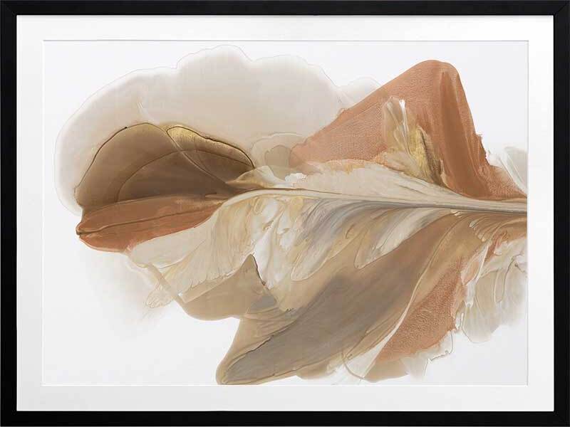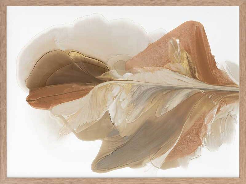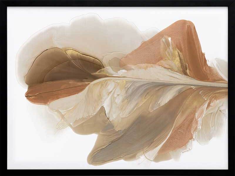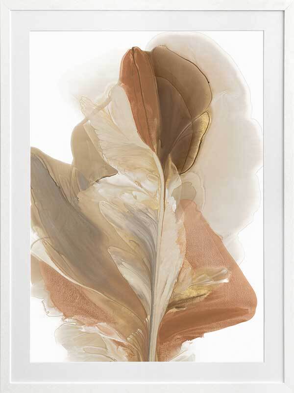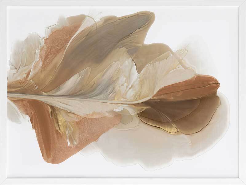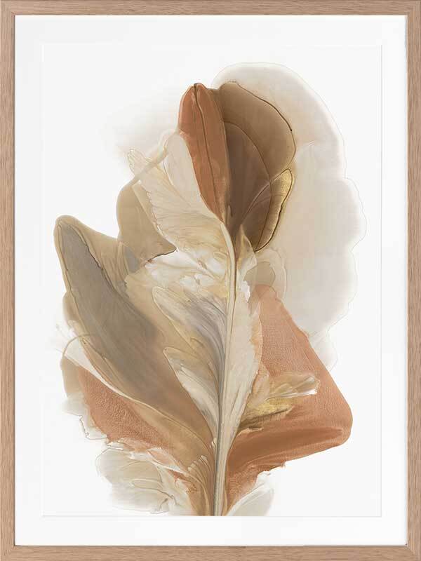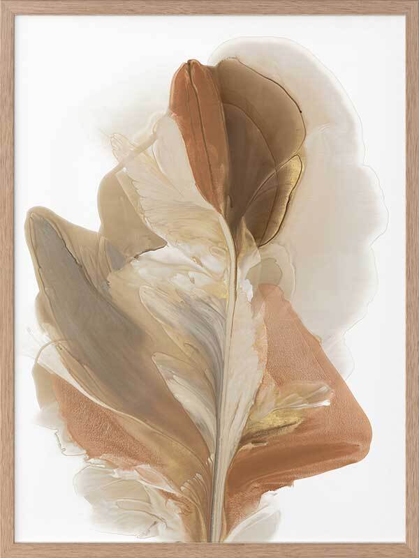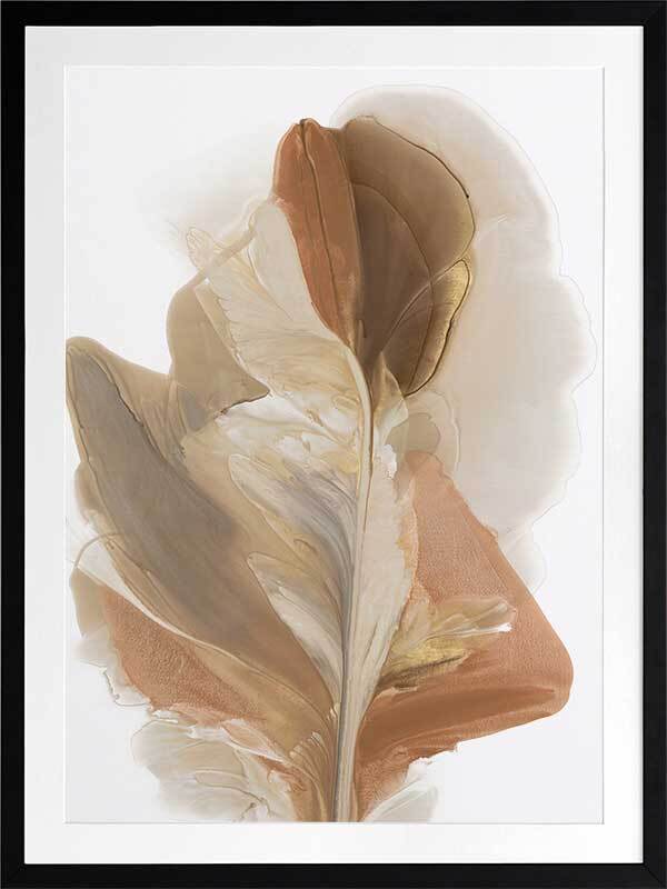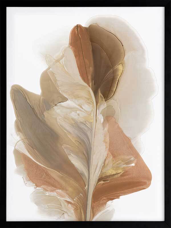 Weightlessness I Framed Art Print - Warmth and elegance are represented in this gorgeous artwork. Add a touch of a decadence to your space from the golden and brown hues in this abstract palm leaf piece. Want a complete set? Pair with our In a Weightlessness II for a gorgeous pairing.