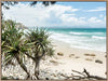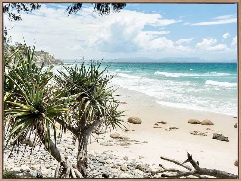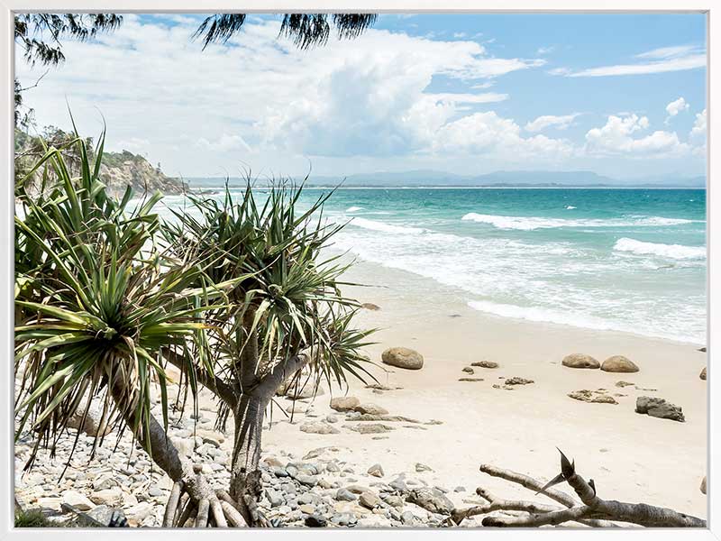 Welcome to Paradise - A beautiful Australian beachfront is highlighted in this photographic print, with the waves rolling in against the sandy shoreline, edged by rocks, driftwood and pandanus trees.