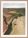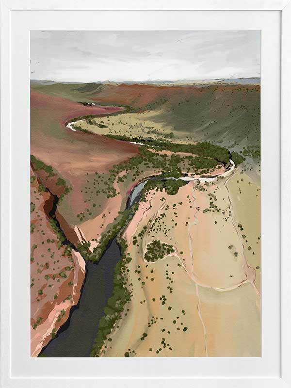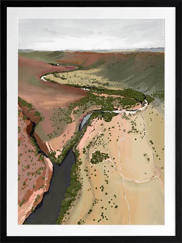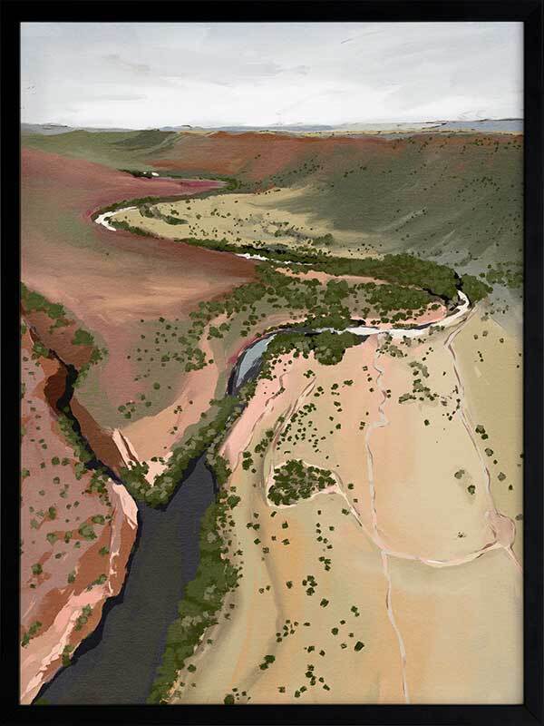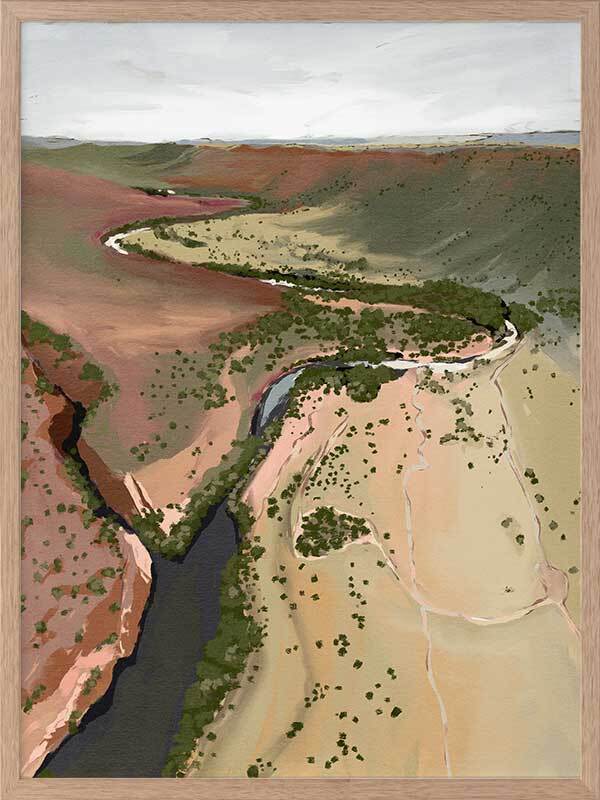 Where The River Runs Framed Art Print - Your eyes are immediately led to the fork of the river and along the meandering path to places not yet discovered. Earthy tones of desert white and rich red ochre nudge up to the riverbanks and dappled trees in deep green are in the foreground. The harmony of natural tones and soft brush strokes in this painterly landscape artwork will invoke the wanderlust into your space.