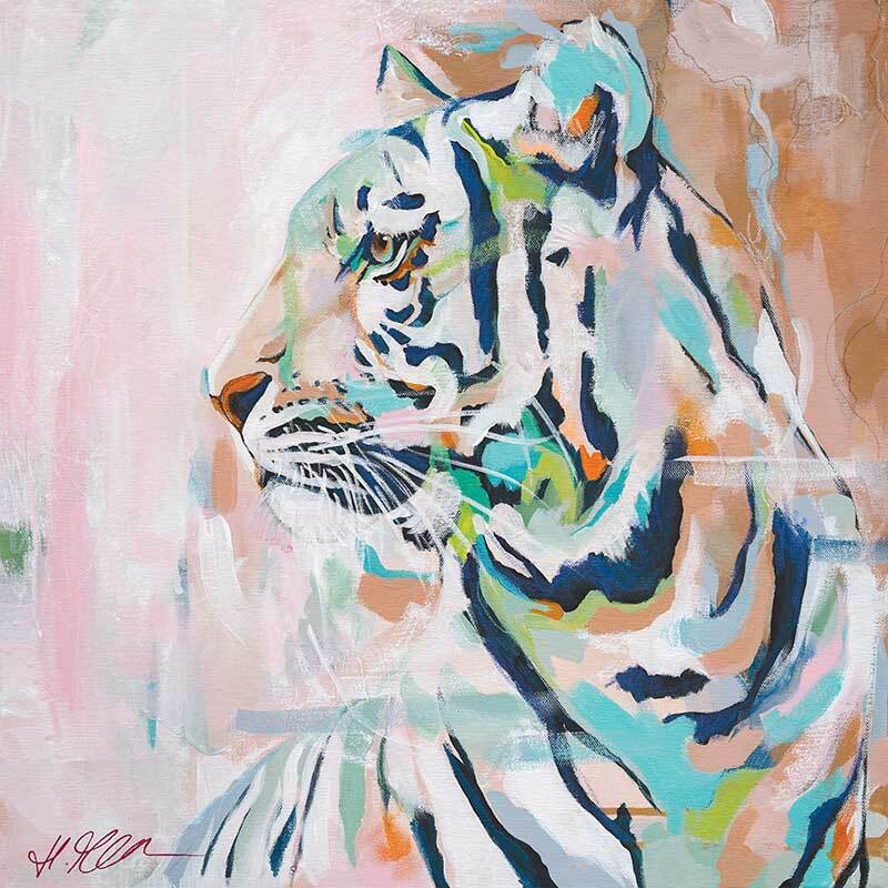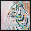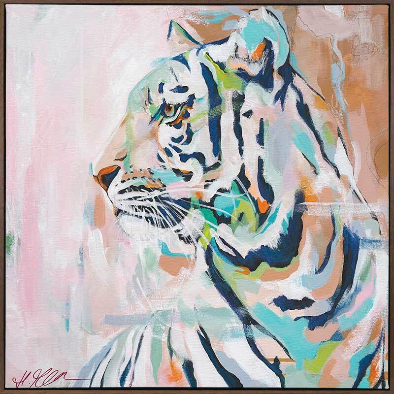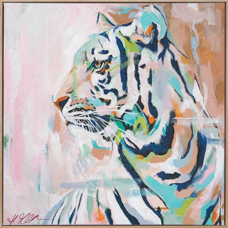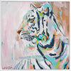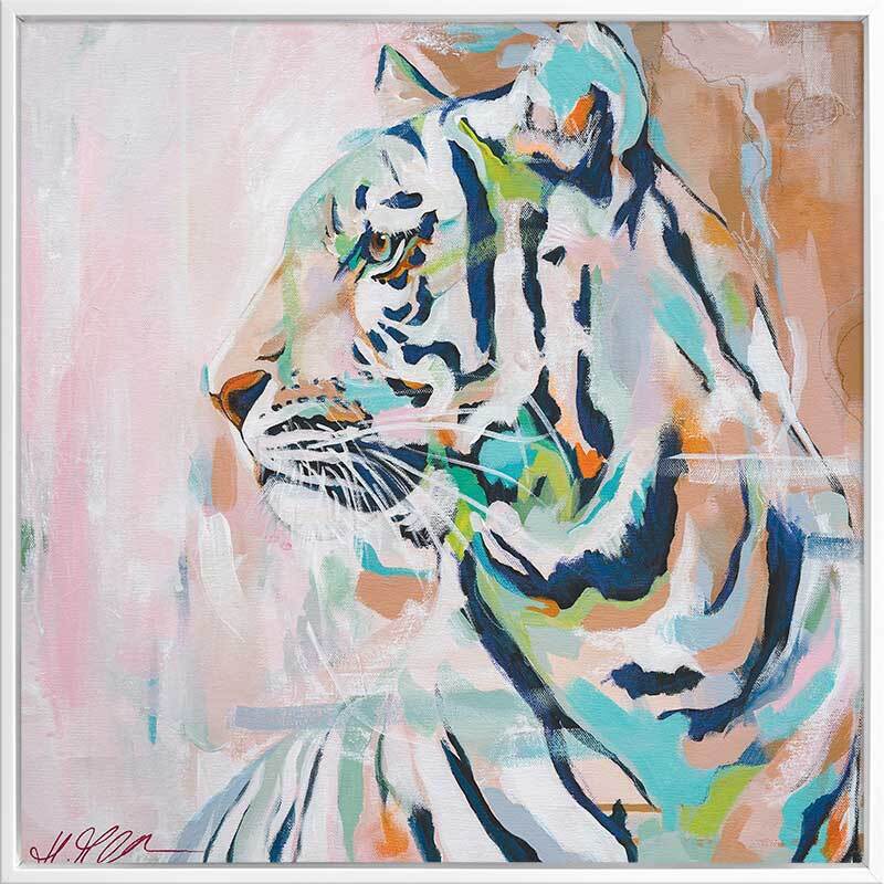 Where the Wild Things Are Canvas Art Print - A different take on portraying the mighty king of the jungle, this gorgeous piece uses a vibrant, yet soft colour palette with varying tones of blue, pink and beige, with highlights of vivid orange and green. As the tiger glances into the distance, an explosion of colour brings out its eternal strength and prowess.