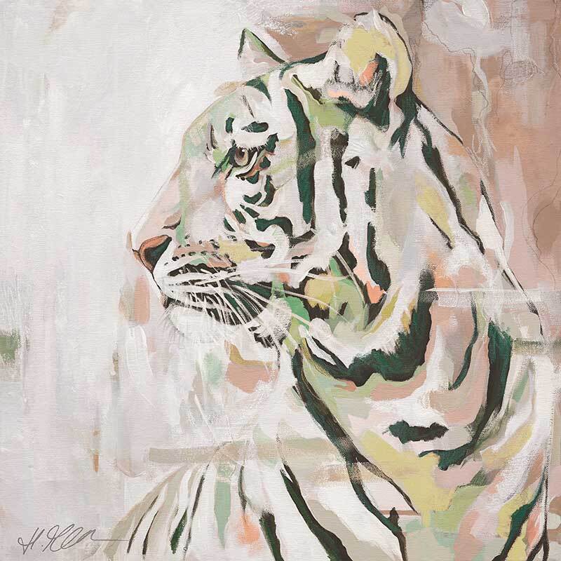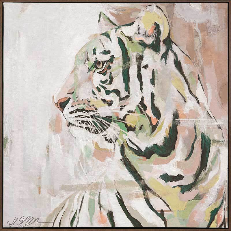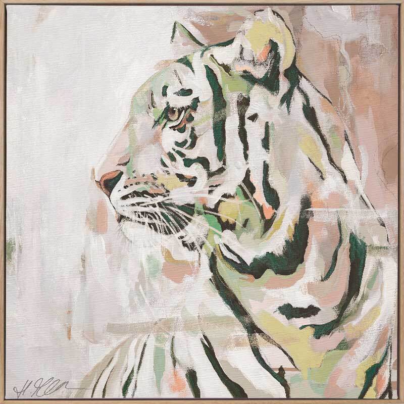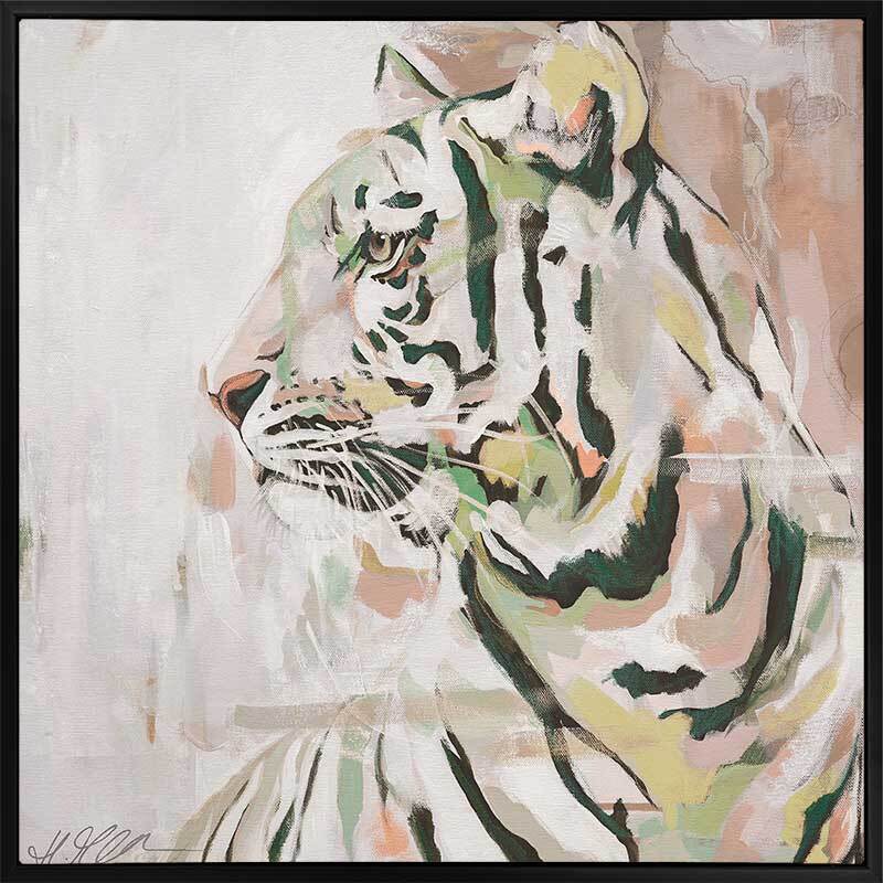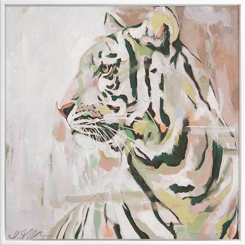 Where the Wild Things Are Muted Green Canvas Art Print - A different take on portraying the mighty king of the jungle, this gorgeous piece uses a muted, soft colour palette with varying tones of beige, white, yellow and green, with accents of orangey pink. As the tiger glances into the distance, this understated palette of muted tones juxtapose its eternal strength and prowess.