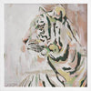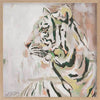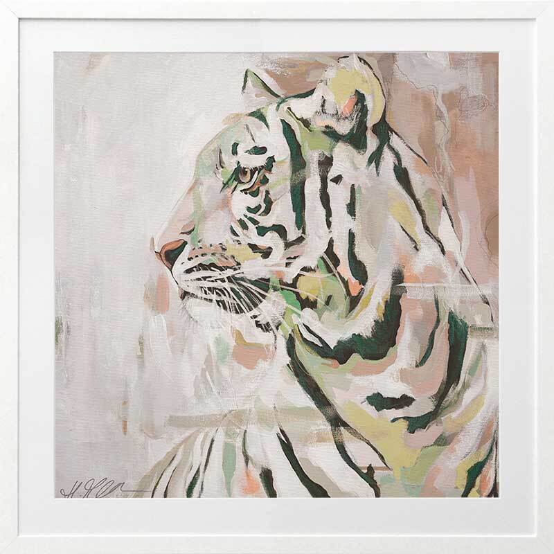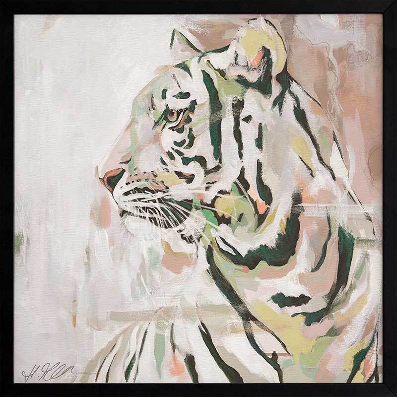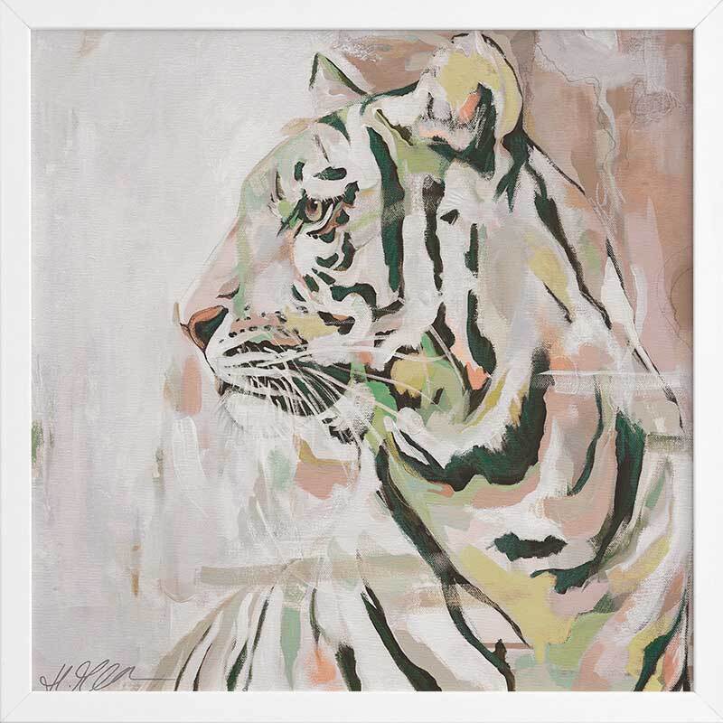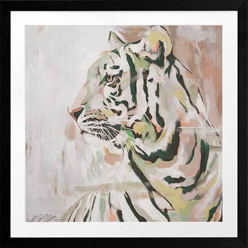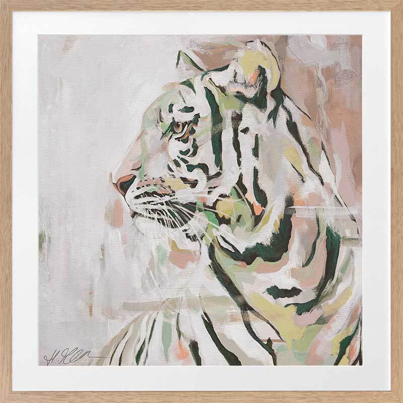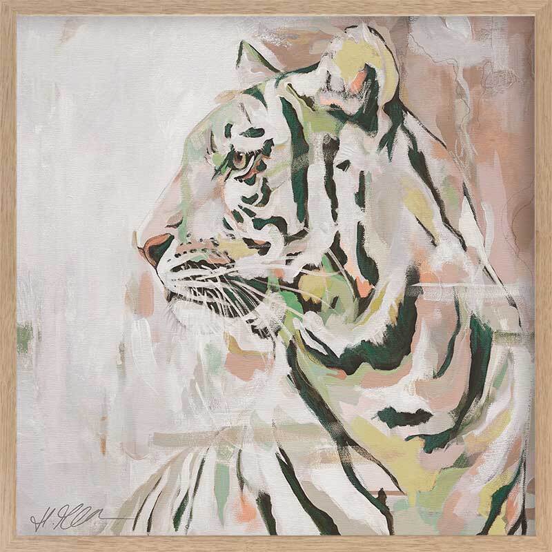 Where the Wild Things Are Muted Green Framed Art Print - A different take on portraying the mighty king of the jungle, this gorgeous piece uses a muted, soft colour palette with varying tones of beige, white, yellow and green, with accents of orangey pink. As the tiger glances into the distance, this understated palette of muted tones juxtapose its eternal strength and prowess.