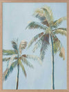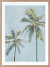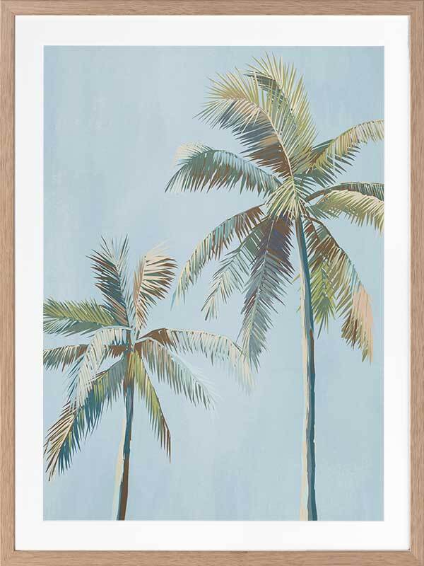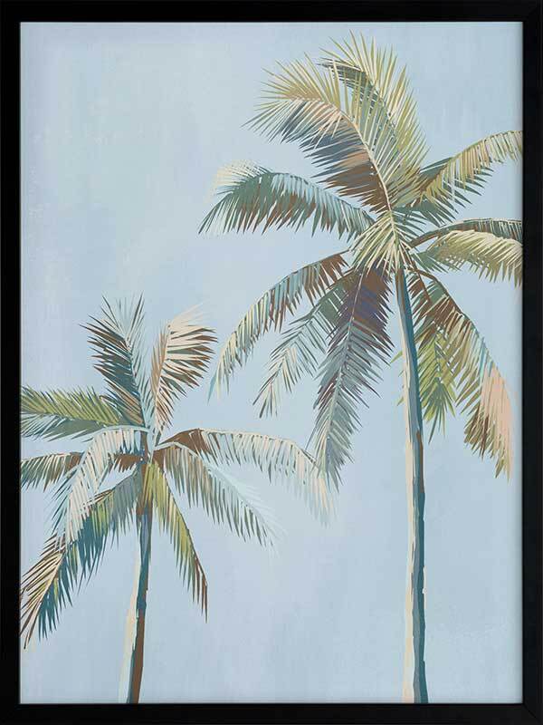 Whispering Palms Framed Art Print - You can't get better than the view from here. Whispering in the breeze and dancing their melodic dance, swaying gently from side to side. Blue skies abound with the glistening of the golden sun on the big glossy green and blue fronds. This contemporary artwork oozes vacay vibes and will bring a relaxed energy to your room.