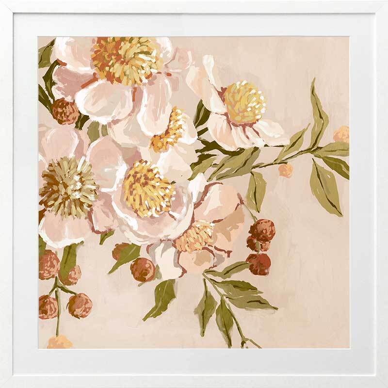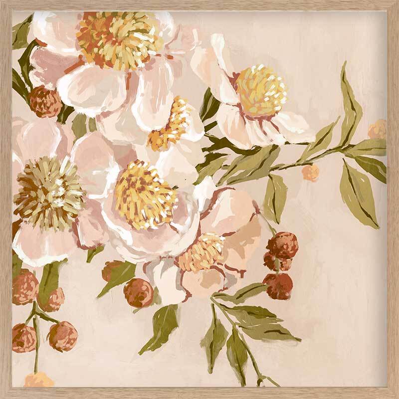 White Daisy Flowers Framed Art Print - Behold this captivating floral artwork, where a blossoming centerpiece gracefully unfolds and flourishes. Imbued with warm undertones, this blush pink-themed painting delicately infuses your home with a subtle burst of color, evoking a gentle and inviting ambiance. The blushing flowers artfully arranged within the composition present a versatile palette of muted pink, green, off-white, yellow, and brown tones, harmoniously blending together to elevate the aesthetic of any space.