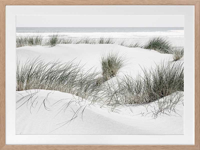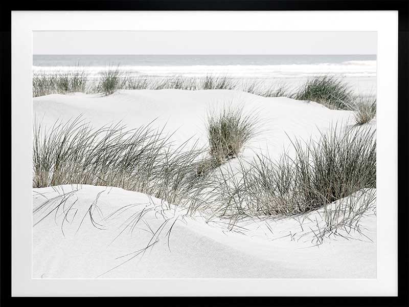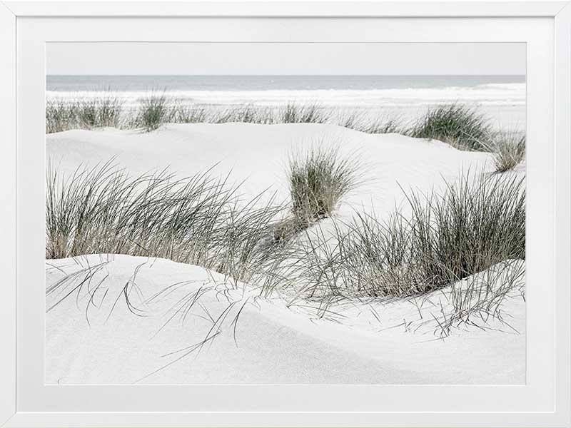 White Sands - A closely cropped photographic print featuring beachgrass growing amongst the white sand dunes, with the ocean crashing in the background.