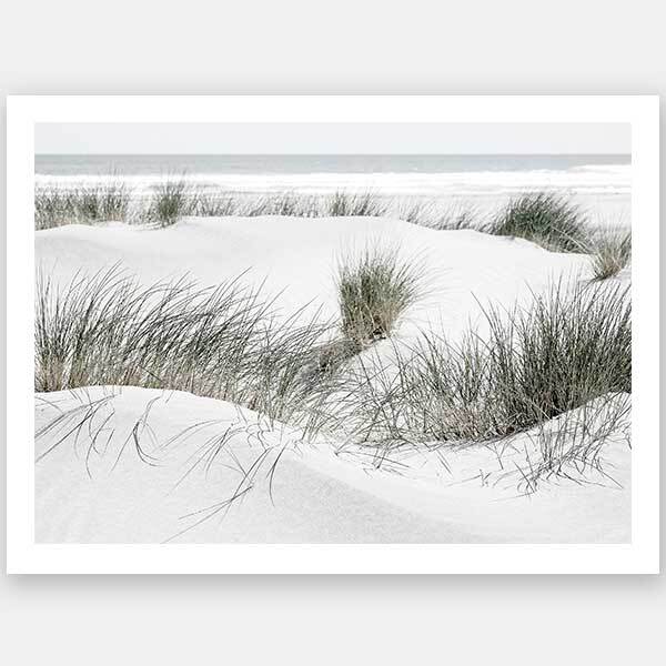 White Sands - A closely cropped photographic print featuring beachgrass growing amongst the white sand dunes, with the ocean crashing in the background.