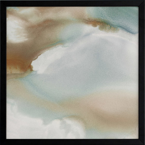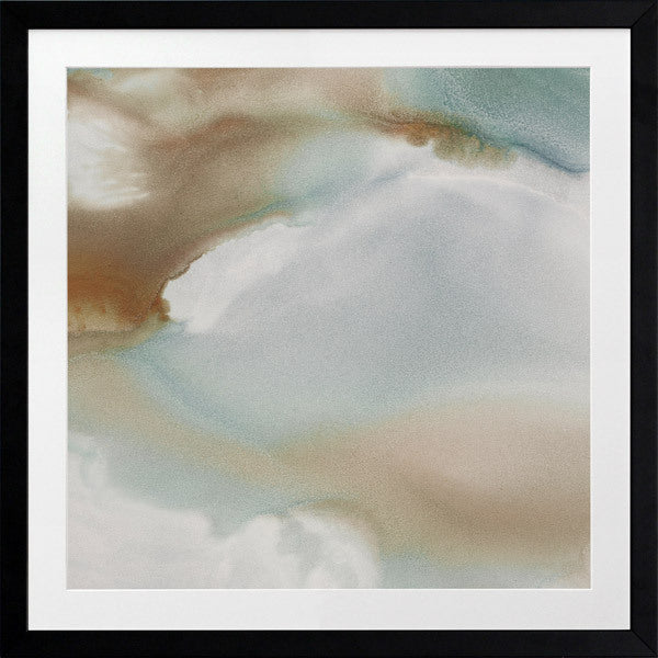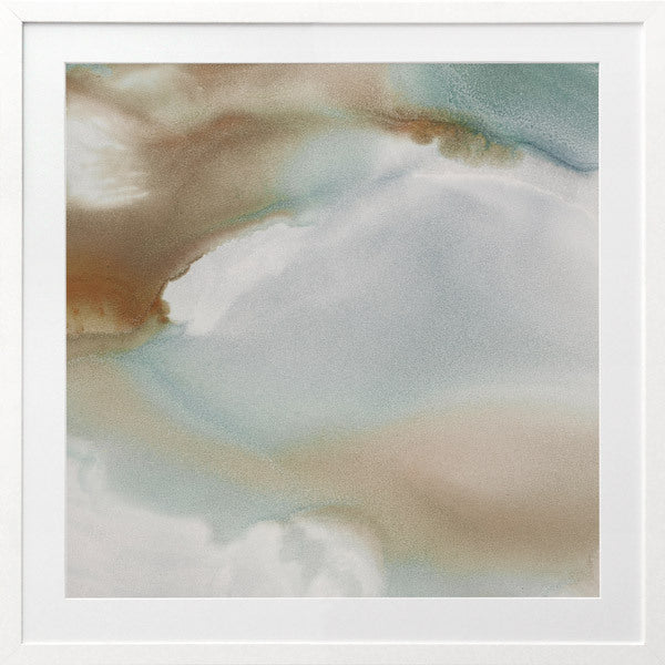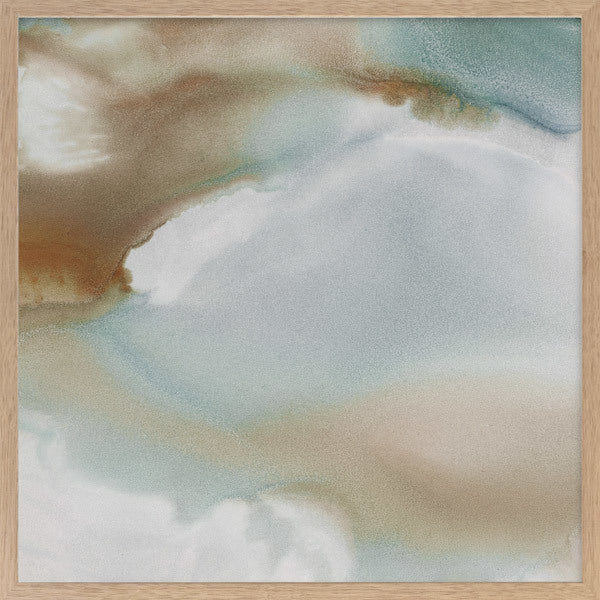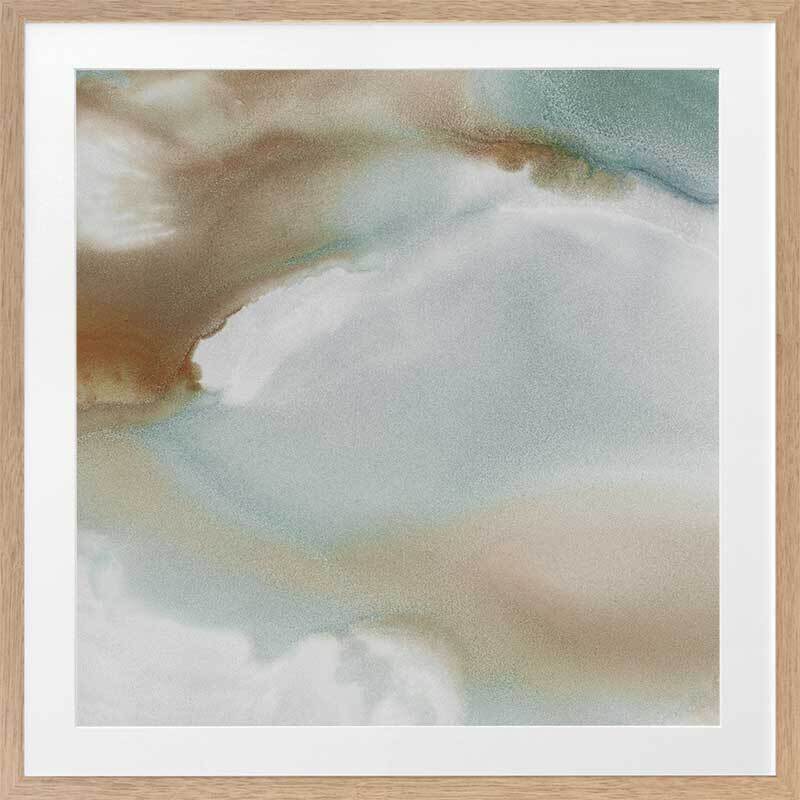 Whitsunday I Framed Print: An abstract artwork featuring a soft marbling of golden brown, smoky blue, cream and white. Pairs with Whitsunday II. 2019 AUTUMN/WINTER COLLECTION: ODYSSEY