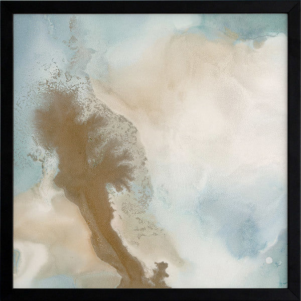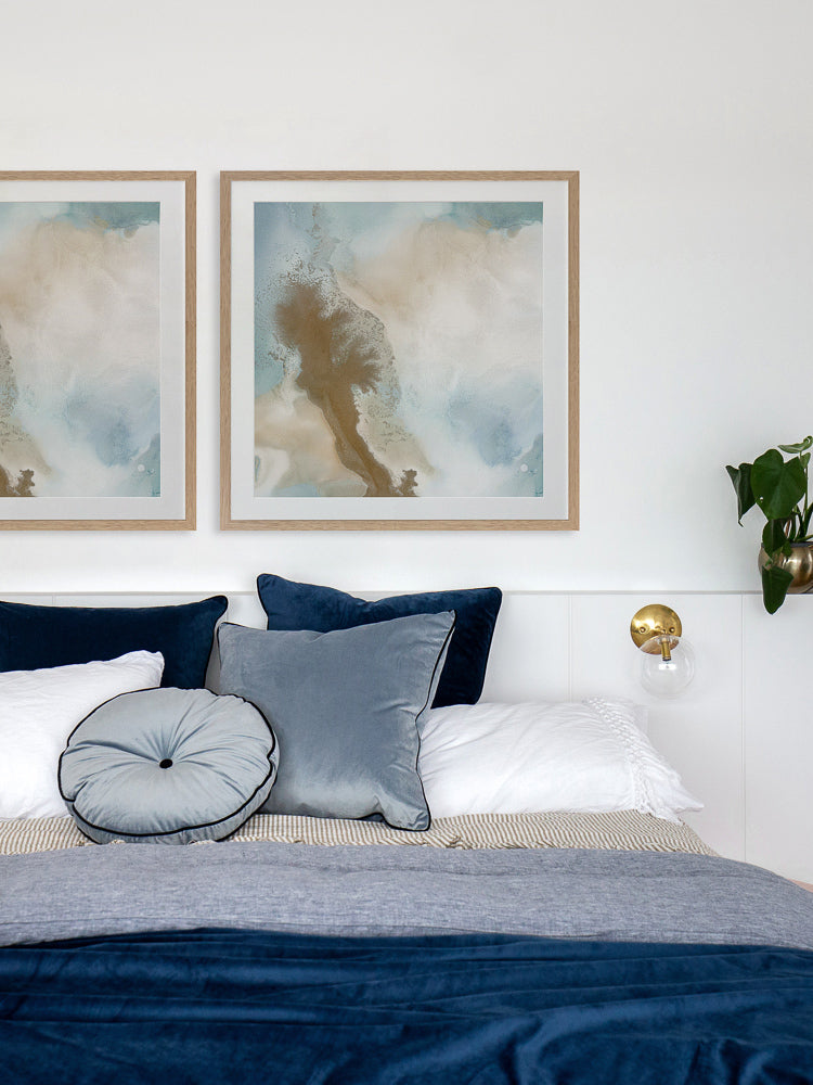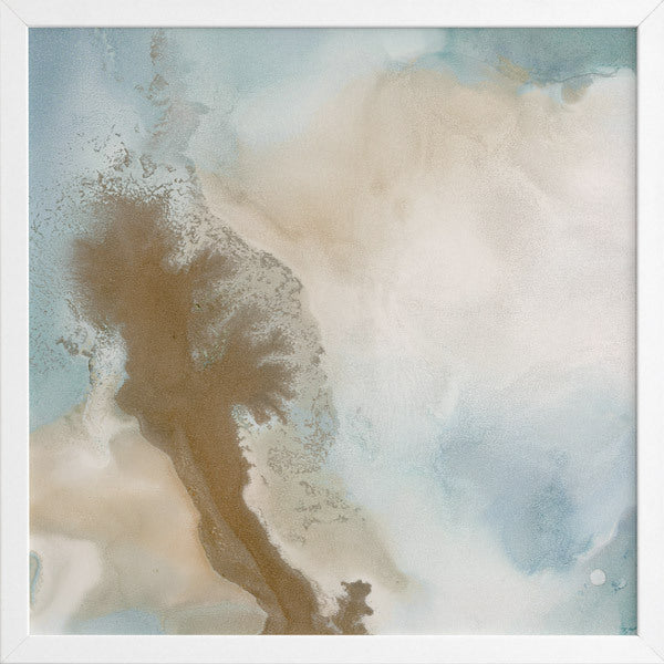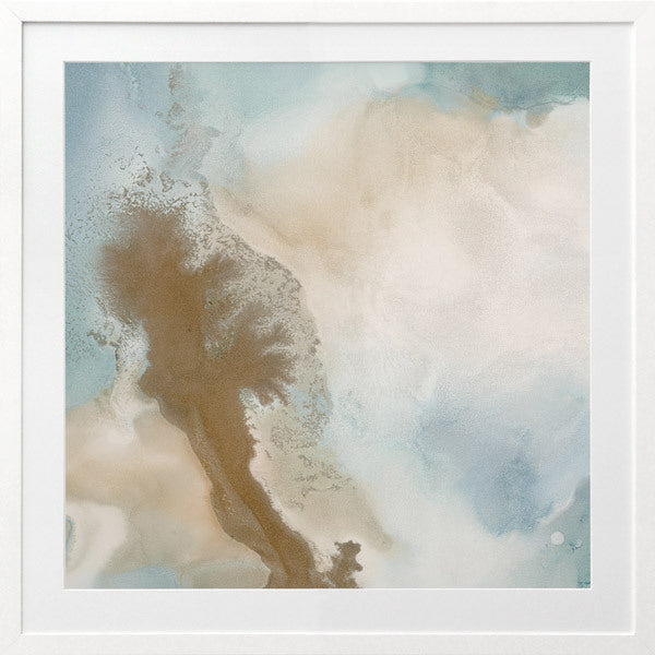 Whitsunday II Framed Print: An abstract artwork featuring a soft marbling of golden brown, smoky blue, cream and white. Pairs with Whitsunday I. 2019 AUTUMN/WINTER COLLECTION: ODYSSEY