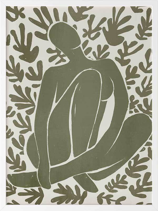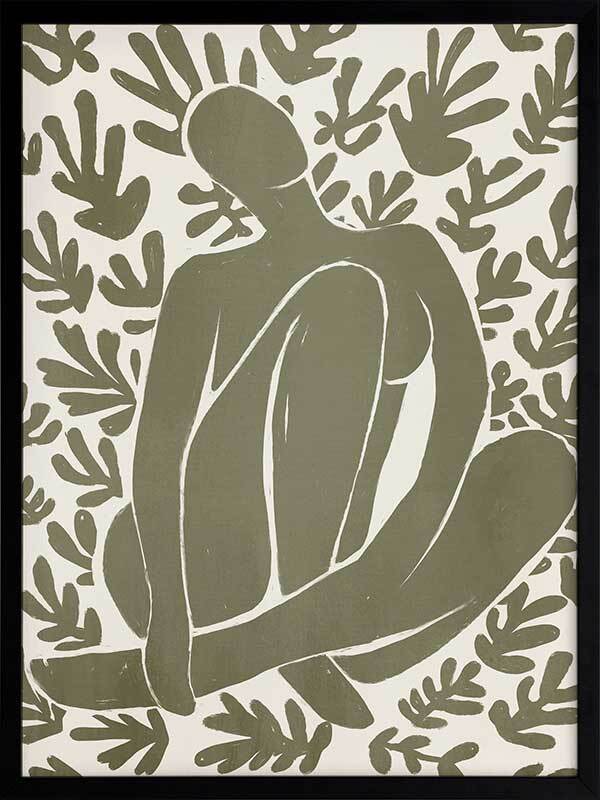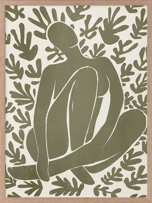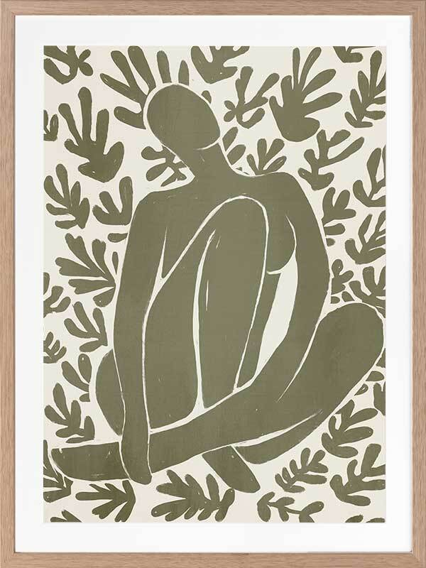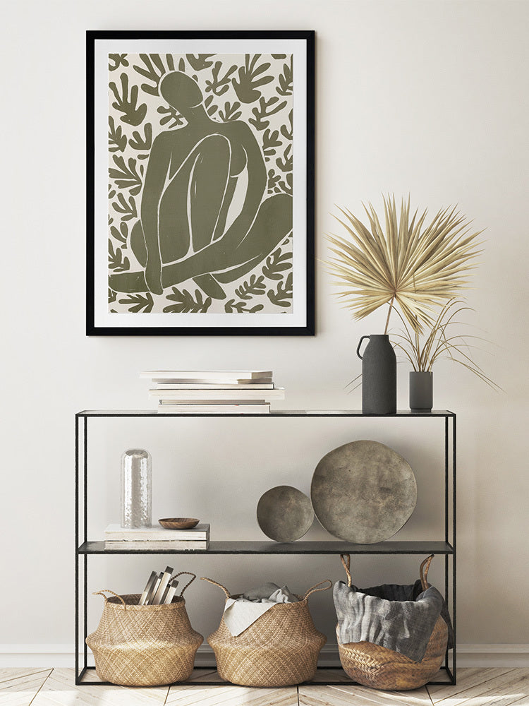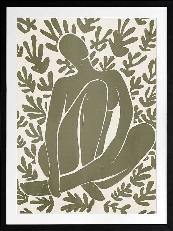 Wholeness I Framed Art Print - Derived from the abstract work of Matisse, this piece uses a muted green shade complimenting a soft cream background. Featuring a human figure in the centre, sitting among organic leaf-like shapes, an overwhelming sense of serenity comes across with thoughtful, smooth brush strokes and uneven linework. An understated energy that brings character to any wall, suitable for most interior styles.