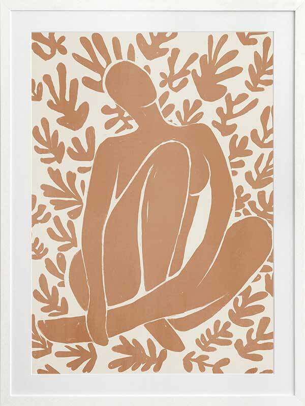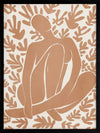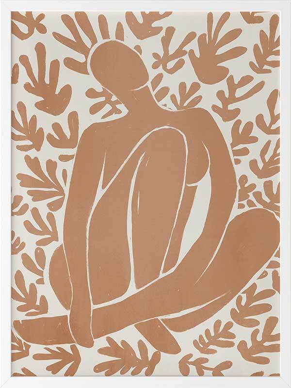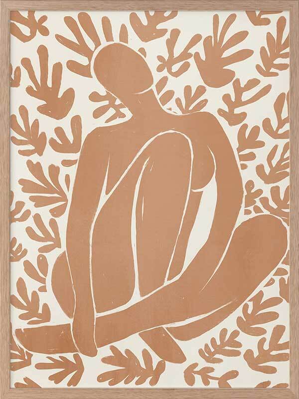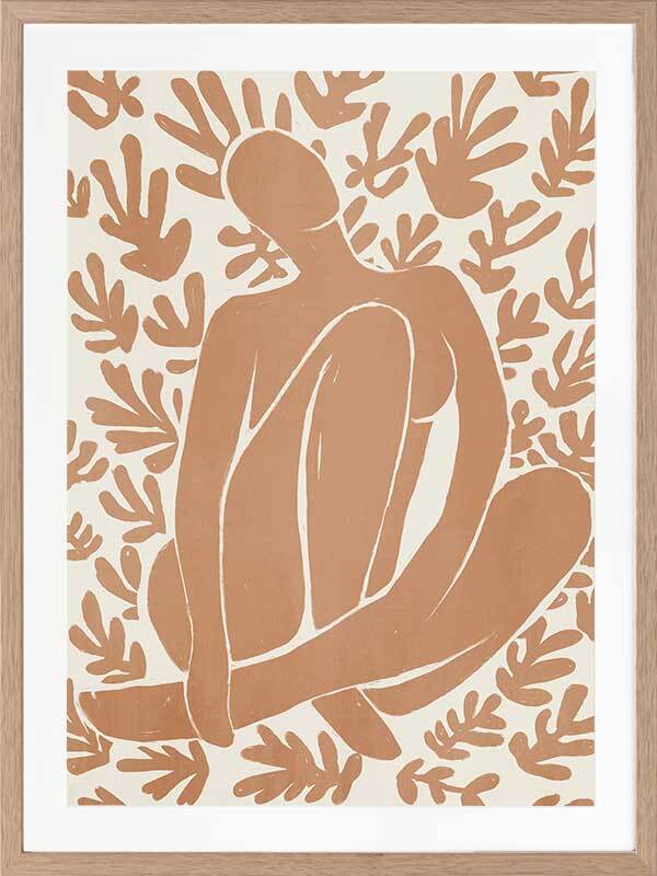 Wholeness V Framed Art Print - Derived from the abstract work of Matisse, this piece uses a light burnt orange shade complimenting a soft cream background. Featuring a human figure in the centre, sitting among organic leaf-like shapes, an overwhelming sense of serenity comes across with thoughtful, smooth brush strokes and uneven linework. An understated energy that brings character to any wall, suitable for most interior styles.