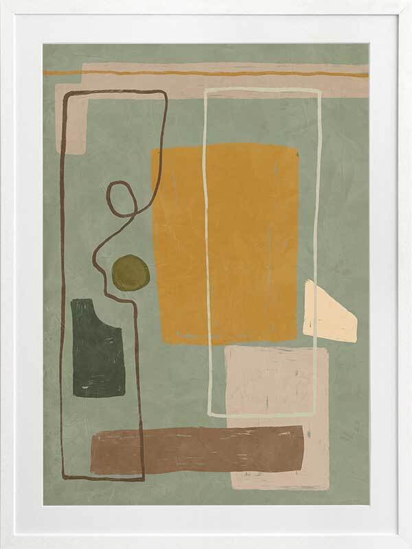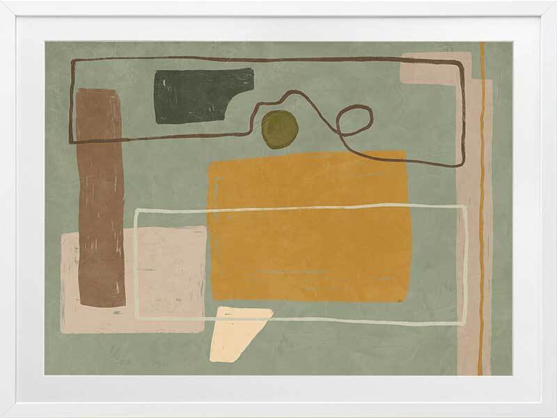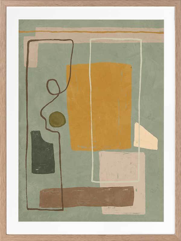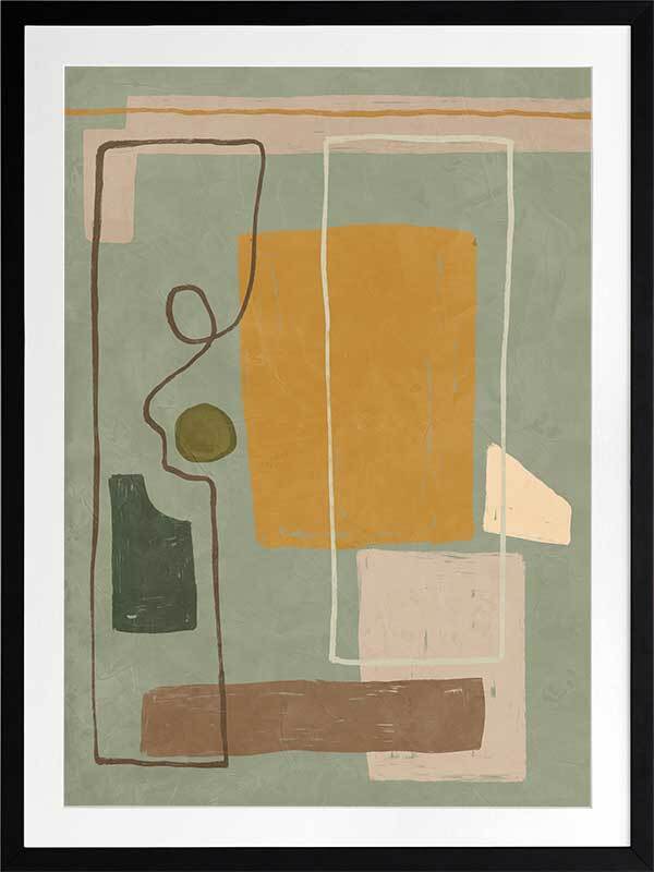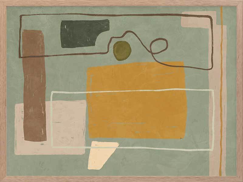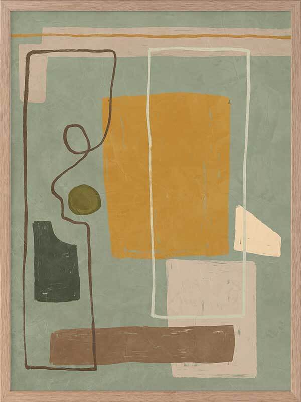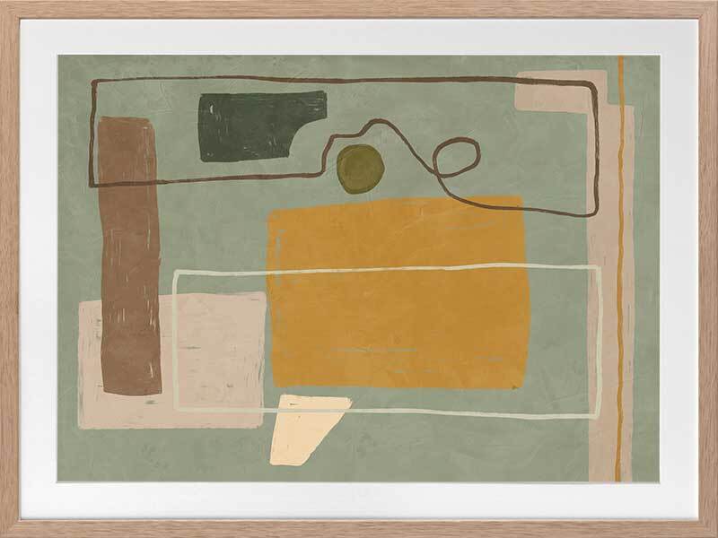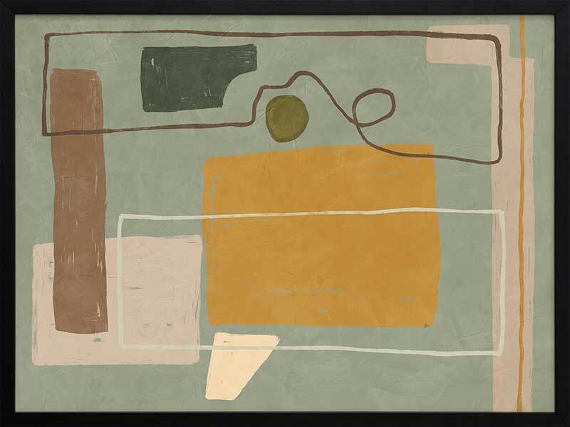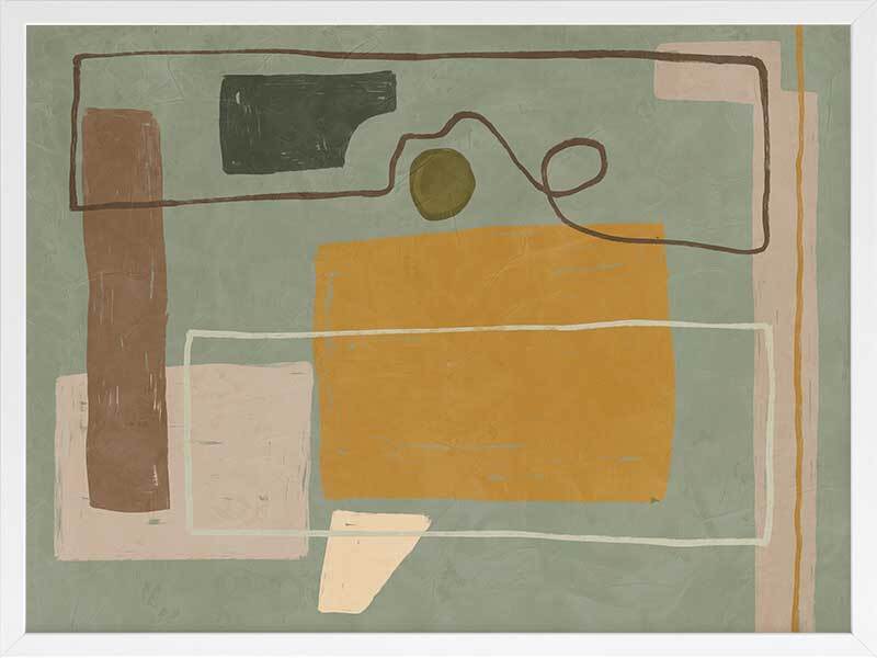 Wild home I Framed Art Print - Drawing inspiration from the influential cubism movement and the creative legacy of great abstract artists, Wild Home is a captivating masterpiece that embodies the very essence of abstract art. With its playful and contemporary European art vibe, this painting showcases a mesmerizing arrangement of random shapes and lines that effortlessly evoke a sense of dynamic motion. The artwork portrays a wild and vibrant home, skillfully combining straight geometric forms with an energetic frenzy. The palette, consisting of muted mustard, cooling sage, brown, and grey tones, is both understated and versatile. Pairs perfectly with Wild Home ll.