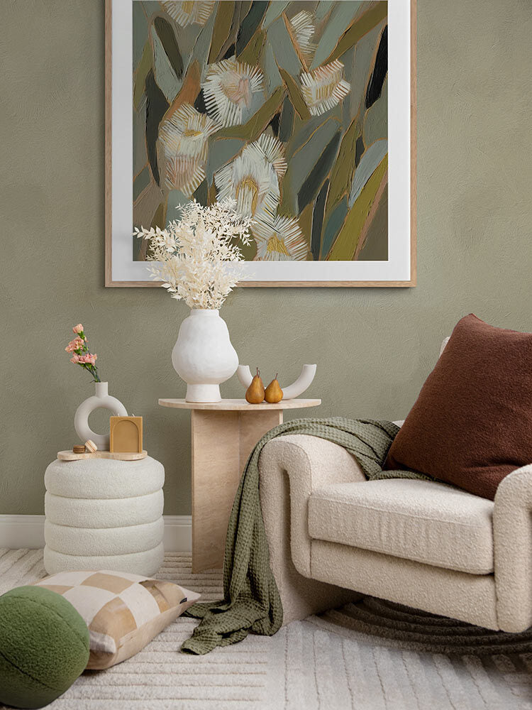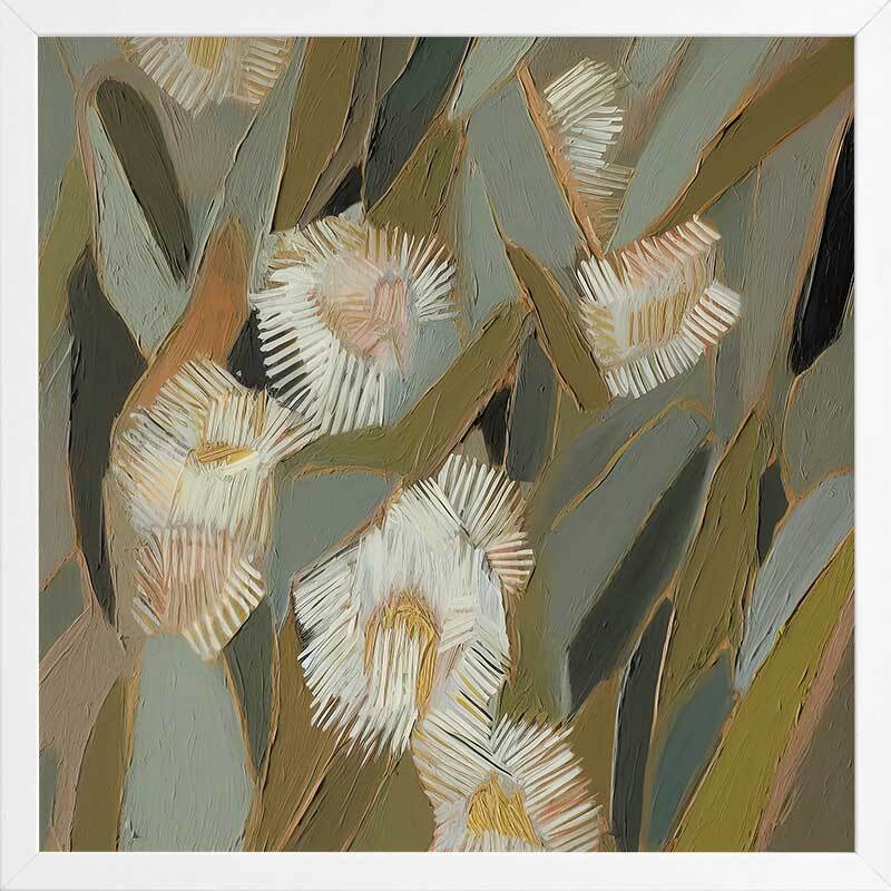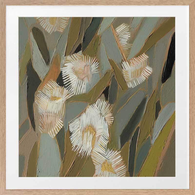 Wild Natives lll Framed Art Print - Embark on a captivating journey with the immersive collection of Wild Natives. Each artwork skillfully captures the serene and earthy beauty of the bottlebrush tree, emanating a tranquil energy that envelops your space. The graceful brushstrokes dance delicately, bringing the leaves and petals to life and evoking a serene sense of motion. Enriched by a palette of muted greens, soft yellows, and soothing ivory tones, these artworks exude a natural and inviting charm. Pair with Wild Natives I and II.