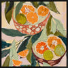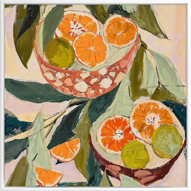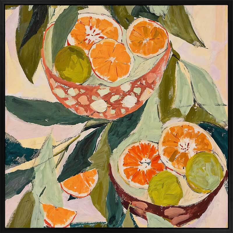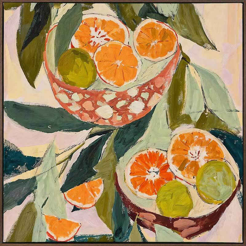 Wild Oranges Canvas Art Print - Amidst the large, flowing leaves, a duo of bowls overflows with slices of oranges, grapefruit, and limes, their rinds a mosaic of orange and chartreuse. Using visible, sweeping brush strokes, this Mexican-themed artwork makes the perfect kitchen wall art with its playful vibrancy.