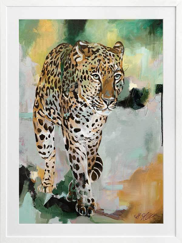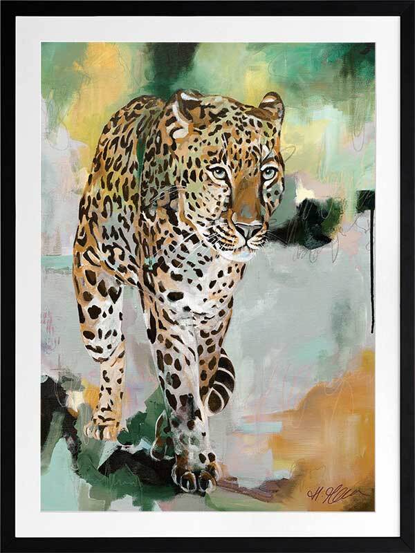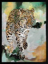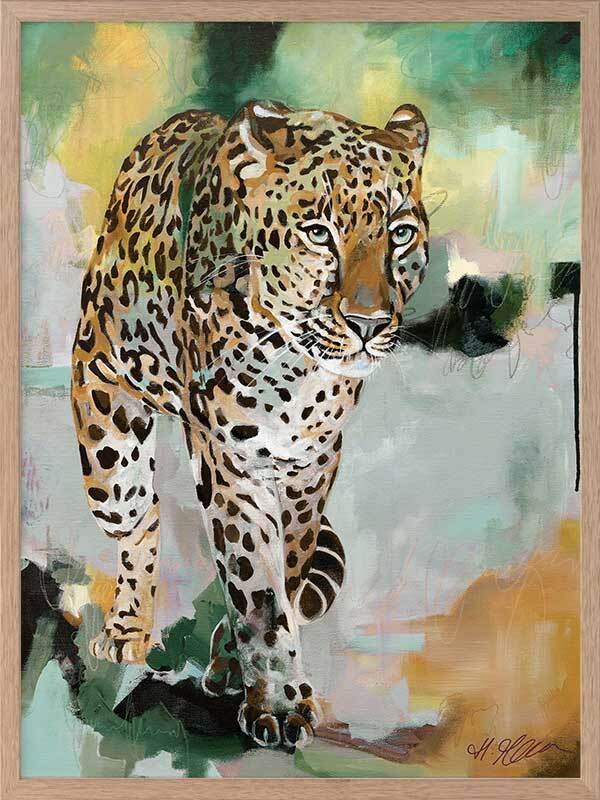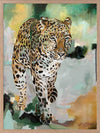 Wildest Dreams Grey Framed Art Print - This curious cat is on a mission, staring intently into the distance, exhibiting her powerful process at every step. A beautiful piece merging abstract and realism with lifelike details against a moving, unblended background, featuring a palette of light and dark green, soft grey, and touches of golden brown.
