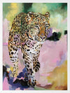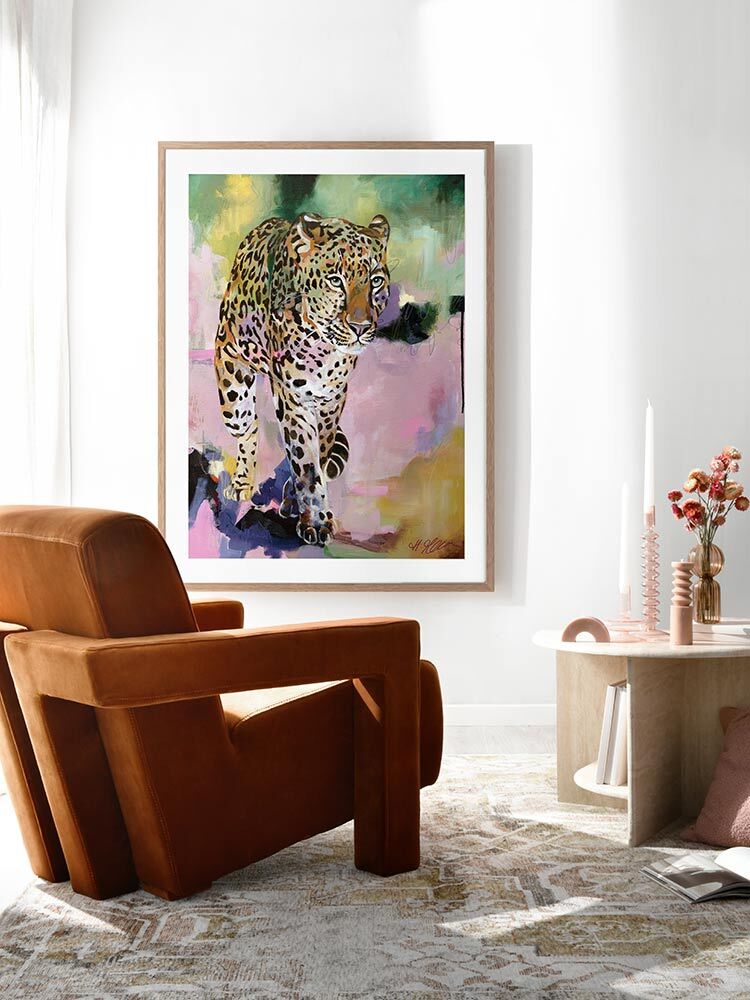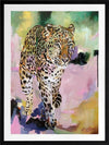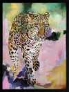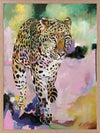 Wildest Dreams Pink Framed Art Print - This curious cat is on a mission, staring intently into the distance, exhibiting her powerful process at every step. A beautiful piece merging abstract and realism with lifelike details against a moving, unblended background, featuring an exciting bold palette of soft pink, light and dark green, and hints of golden brown.