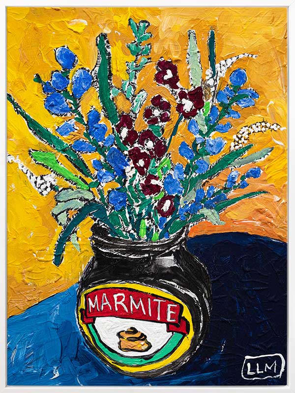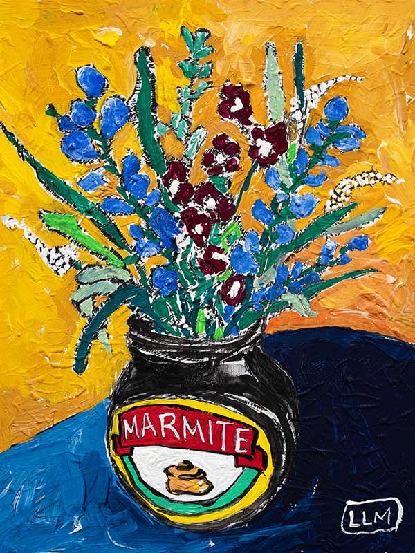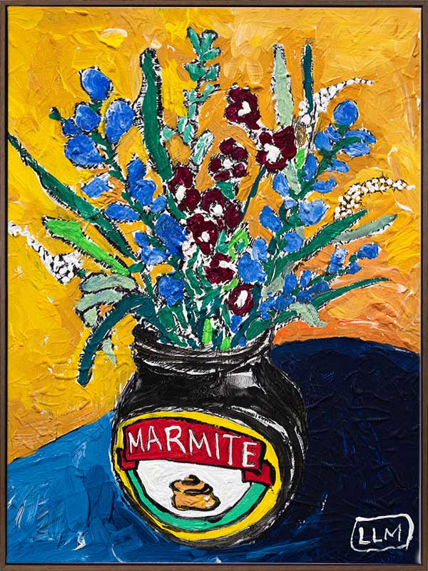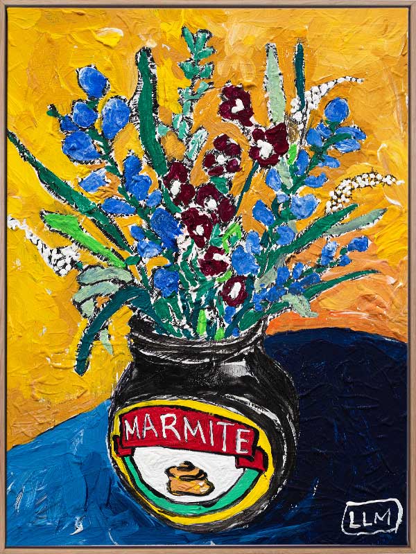 Wildflower Marmite - This art print has a striking abstract yellow and orange background which contrasts against the blue tones of the tabletop. Small blue, maroon and white blooms are displayed in a repurposed Marmite jar in this acrylic still life poster. An iconic Australiana art print. Lara Meintjes is a US-based, South African painter who isn't afraid to experiment mixing bold colours with soft floral imagery. The depth of creativity in her pieces inspires you to find the calm within the chaos.