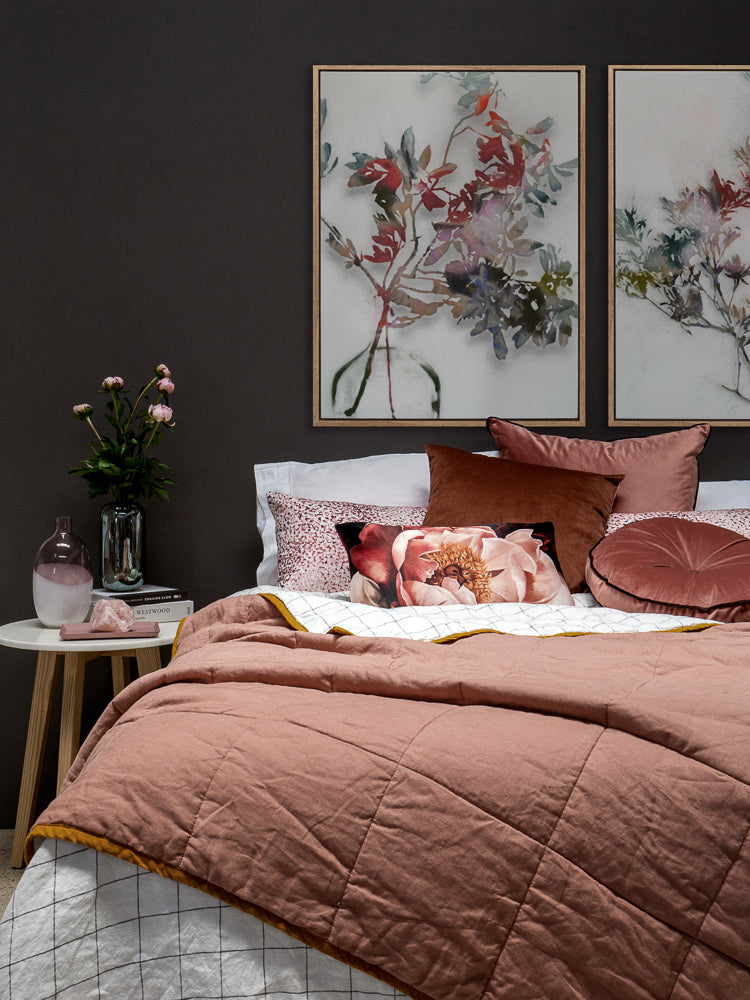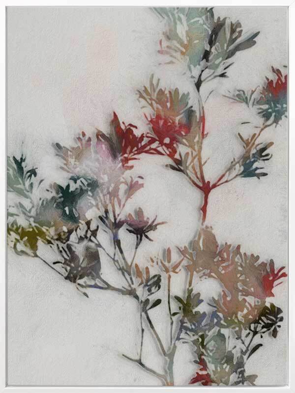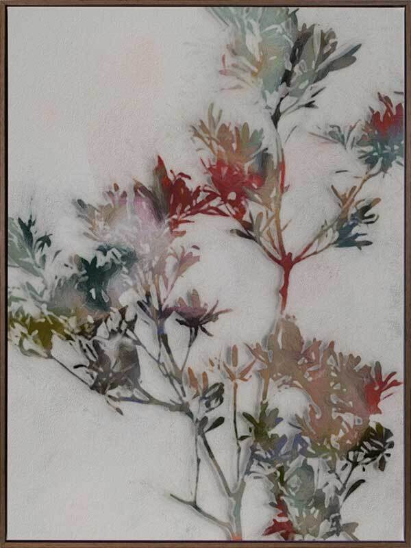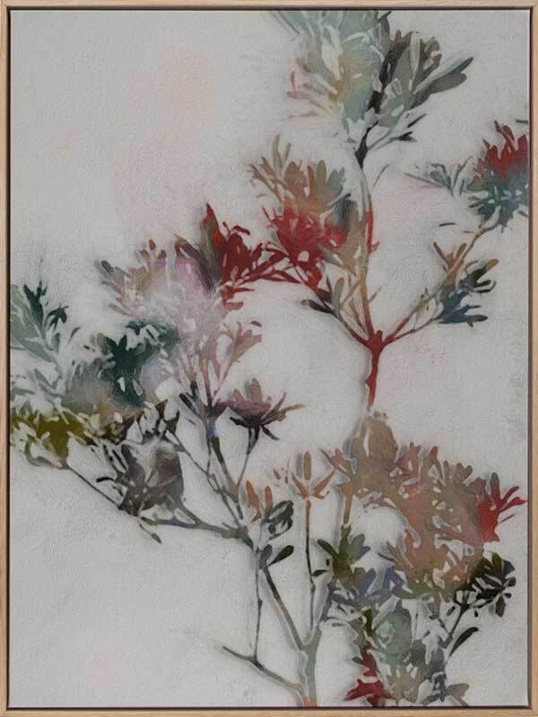 Winter Posy II Canvas Art Print: A vintage-inspired artwork featuring a painterly floral arrangement in shades of burgundy, sage, lilac, green and brown. on a grey background, and overlayed with a distressed texture. Pairs with Winter Posy I. 2019 AUTUMN/WINTER COLLECTION: ODYSSEY