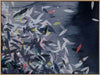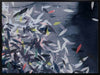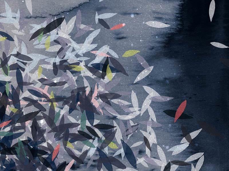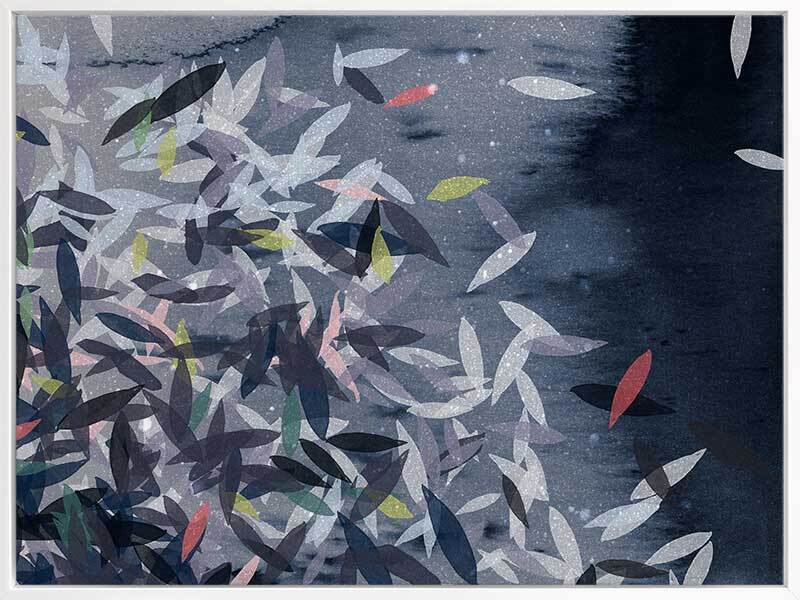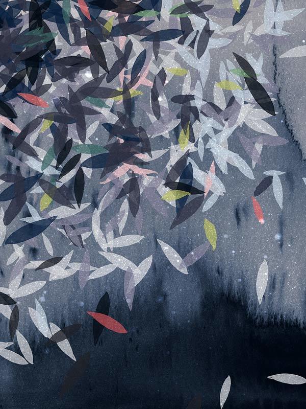 Winter Rain Canvas Art Print: A beautifully textured artwork, featuring falling leaves in a deep blue colour palette, with pops of yellow, pink and green. 2018 SPRING/SUMMER COLLECTION: REMINISCE
