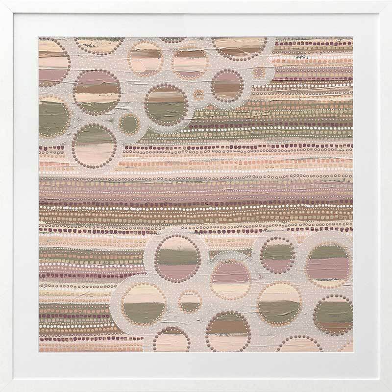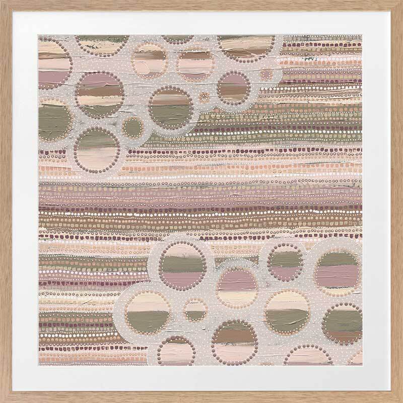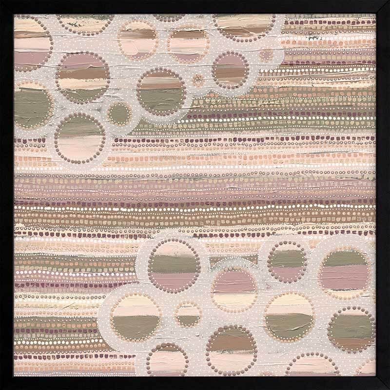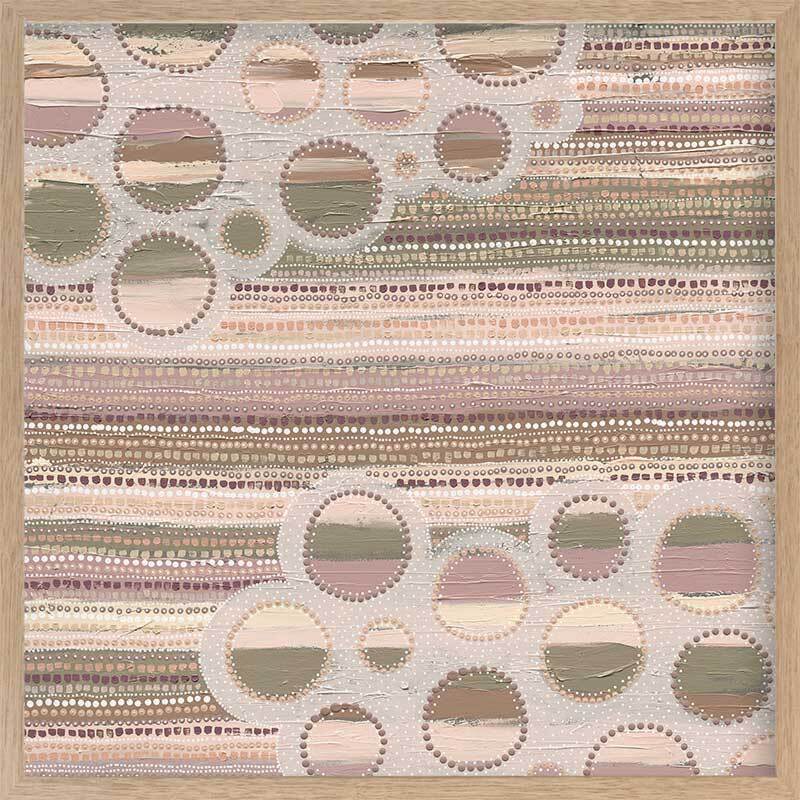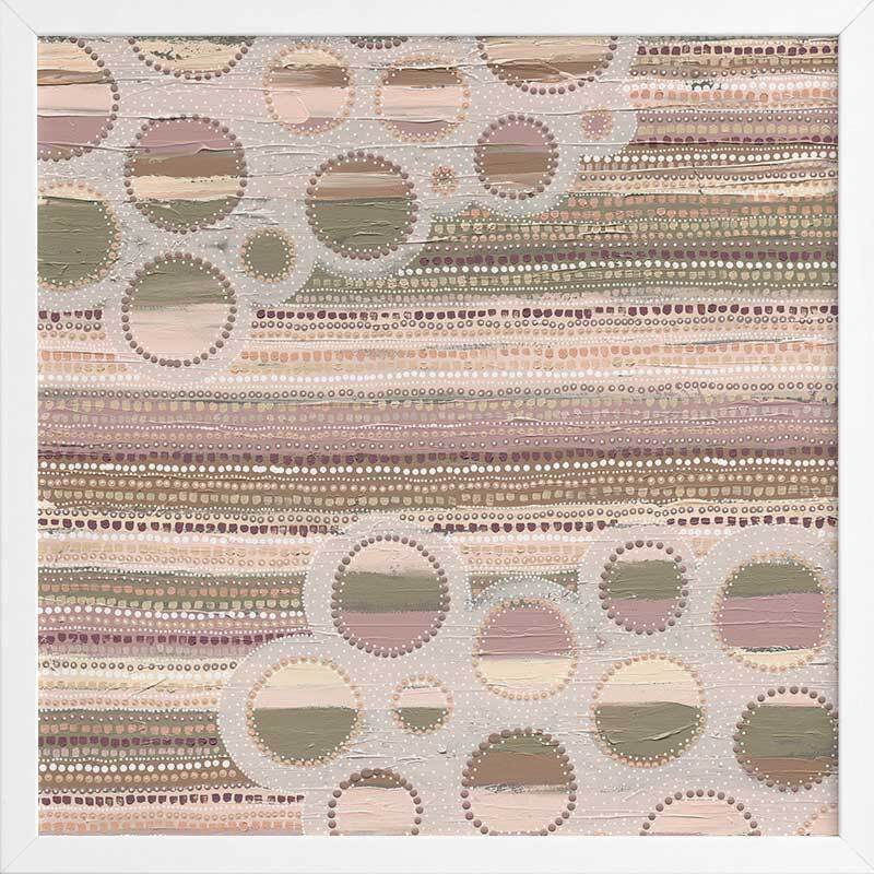 Wiradyuri Yiramiilan Purple Framed Art Print - With a distinctive, muted colour palette of pink and purple undertones, this Indigenous Aboriginal artwork uses traditional dot painting for a uniform look and feel. Horizontal lines are broken up by lighter coloured holes, giving an effect of movement, like clouds passing through a rainy sky. A versatile piece for any room.