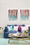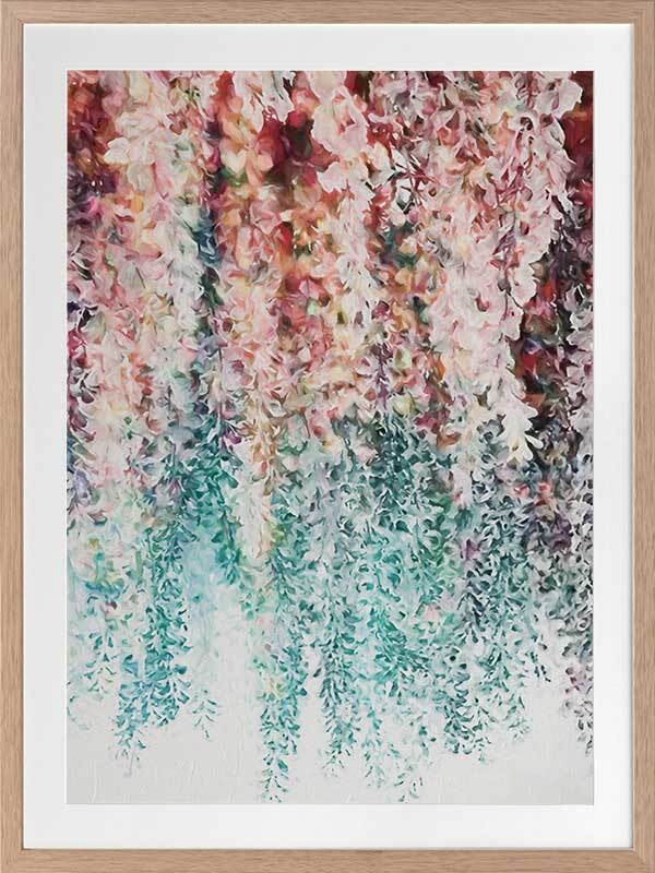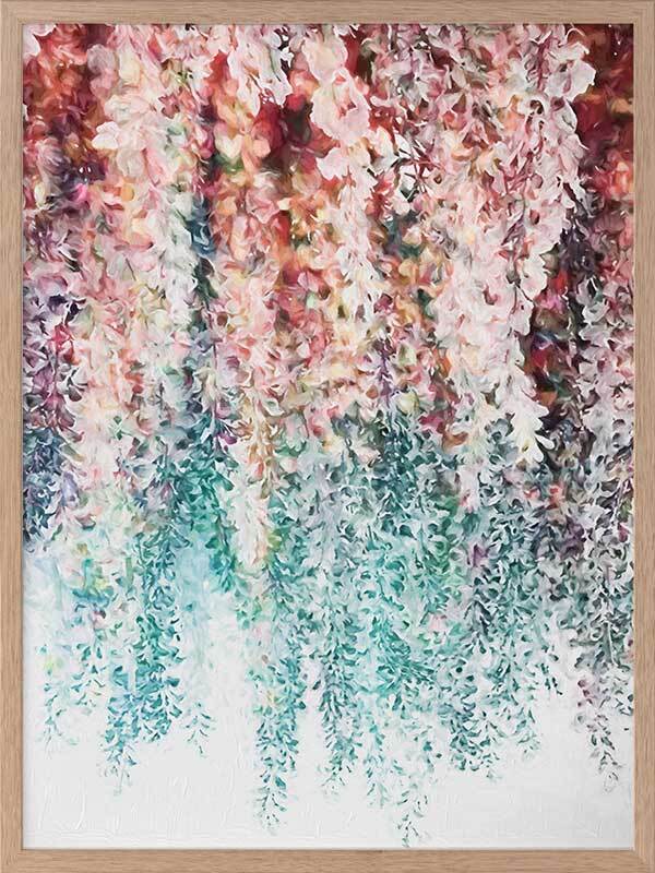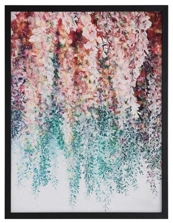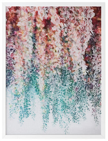 Wisteria Lane I Framed - Abstract painting of hanging wisteria flowers in pink, red and teal, a modern twist on a floral still life. 2016 WINTER COLLECTION: INSPIRE