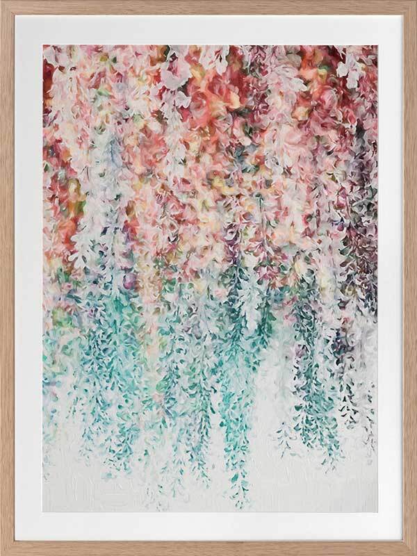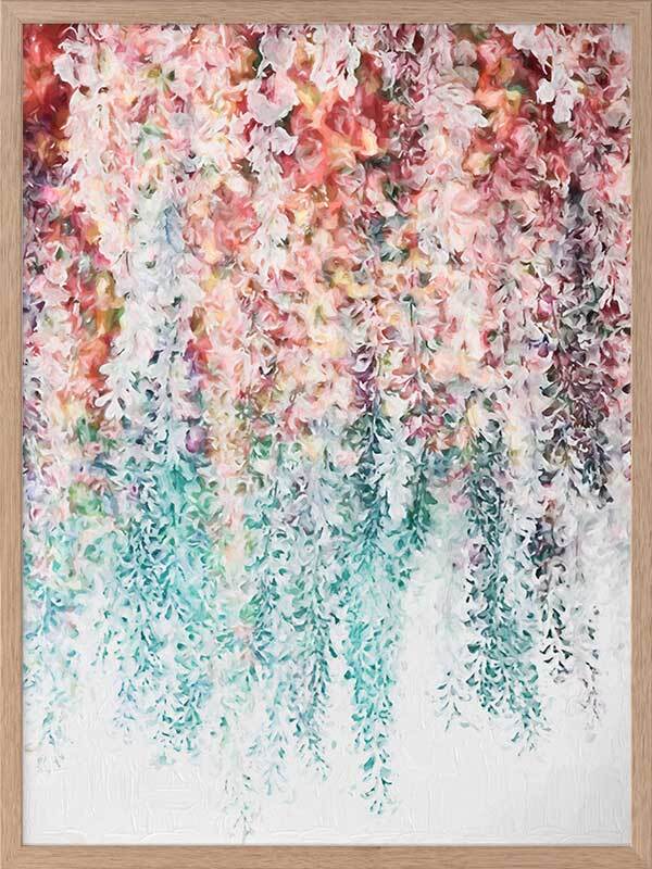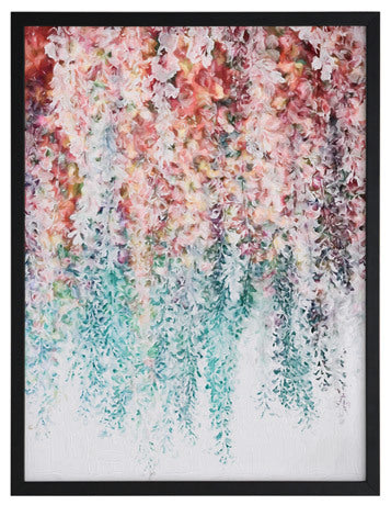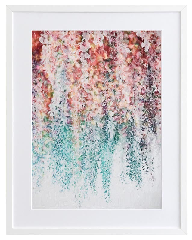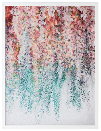 Wisteria Lane II Framed - Abstract painting of hanging wisteria flowers in pink, red and teal, a modern twist on a floral still life. 2016 WINTER COLLECTION: INSPIRE