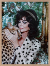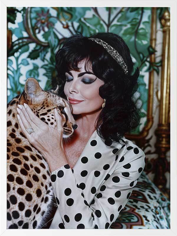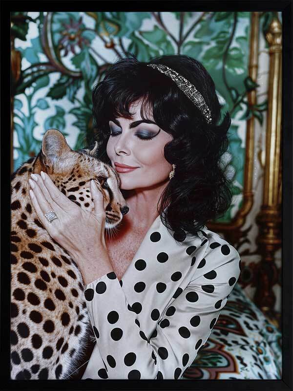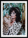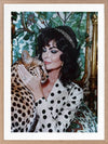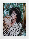 Woman's Best Friend Framed Art Print - Immerse yourself in the opulent allure of this photographic artwork. A woman, exuding retro glamour, embraces a cheetah, against an art deco-inspired background, with a mix of green, white, and black shades throughout. This wall art will bring a playful charm to any living room or bedroom, evoking the grandeur of a bygone era.