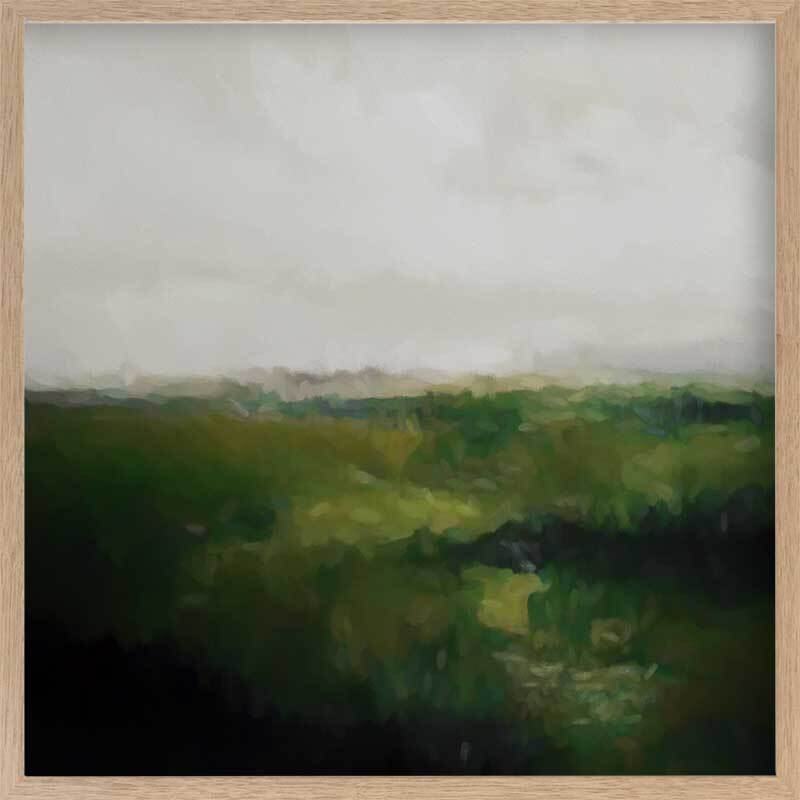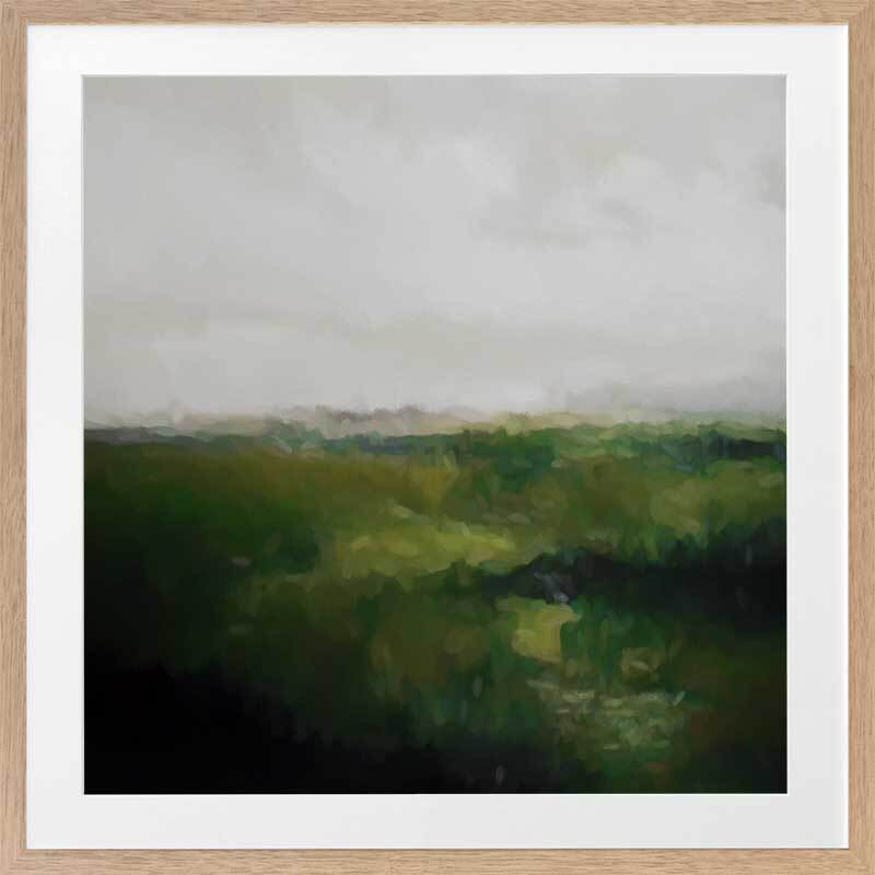 Woodroffe Framed Print: A tranquil art print of an oil-painted landscape artwork featuring a fresh, green treescape against a soft, grey sky. Pairs with Brumlow Top. 2018 SPRING/SUMMER COLLECTION: REMINISCE
