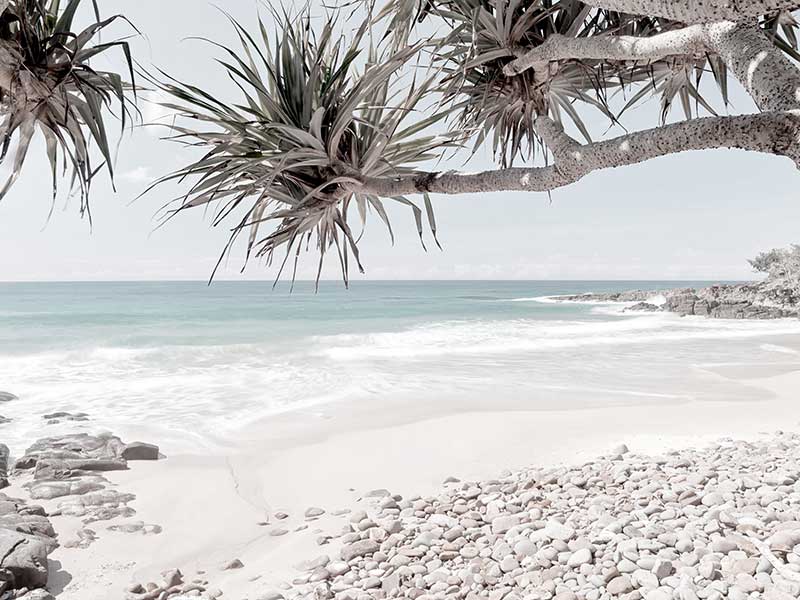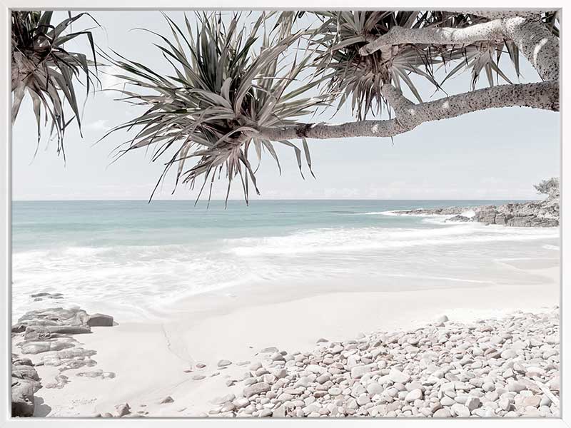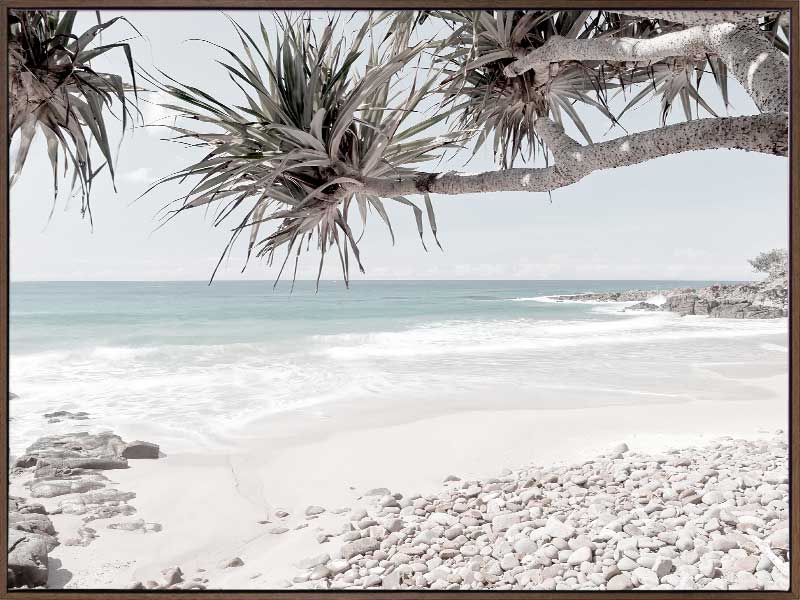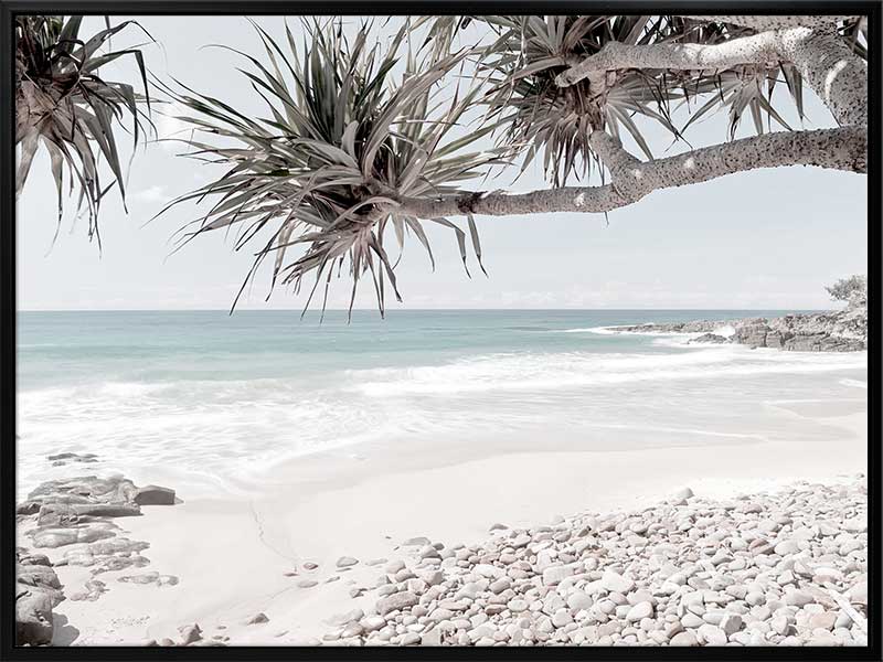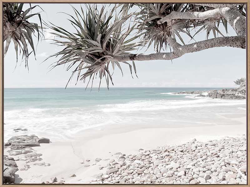 Wouldn't it be Nice - Coastal beauty comes to life in this desaturated photographic artwork, featuring a wide, rocky ocean shore line framed by pandanus trees.