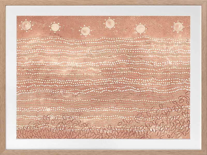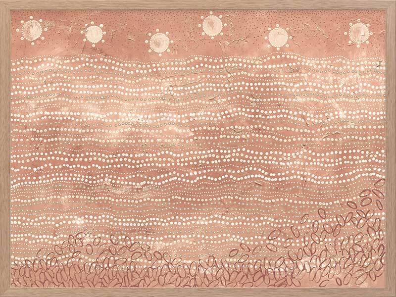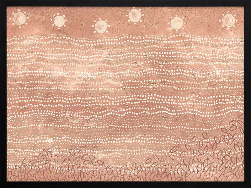 Wubunginya Peach Framed Art Print - Wubunginya -"To Dive". Soft and effortless, this piece uses traditional Indigenous Aboriginal dot painting to create a uniform feel, yet embraces imperfections with uneven lines and randomised composition. A warm peachy-beige palette brings a soft, neutral feel, with inclusions of soft white and darker blush tones to create depth and movement.