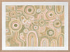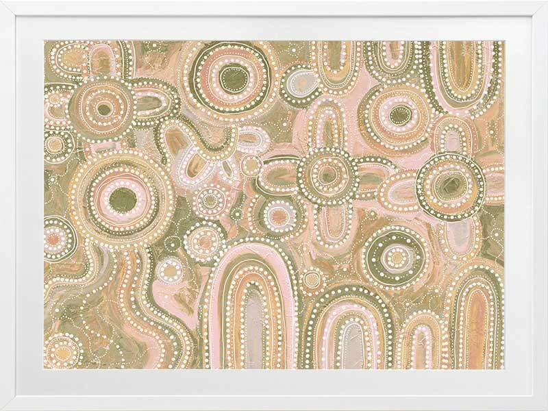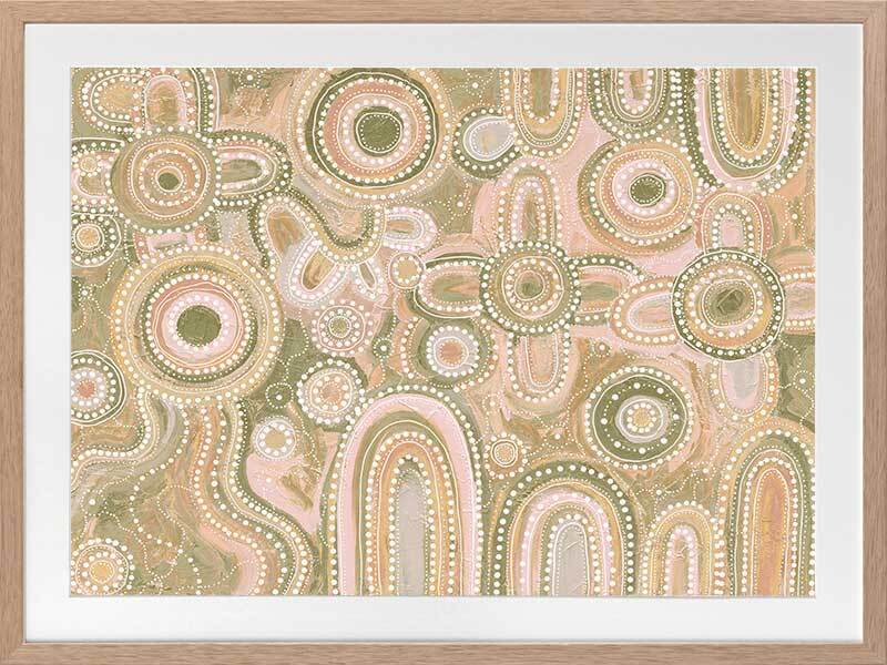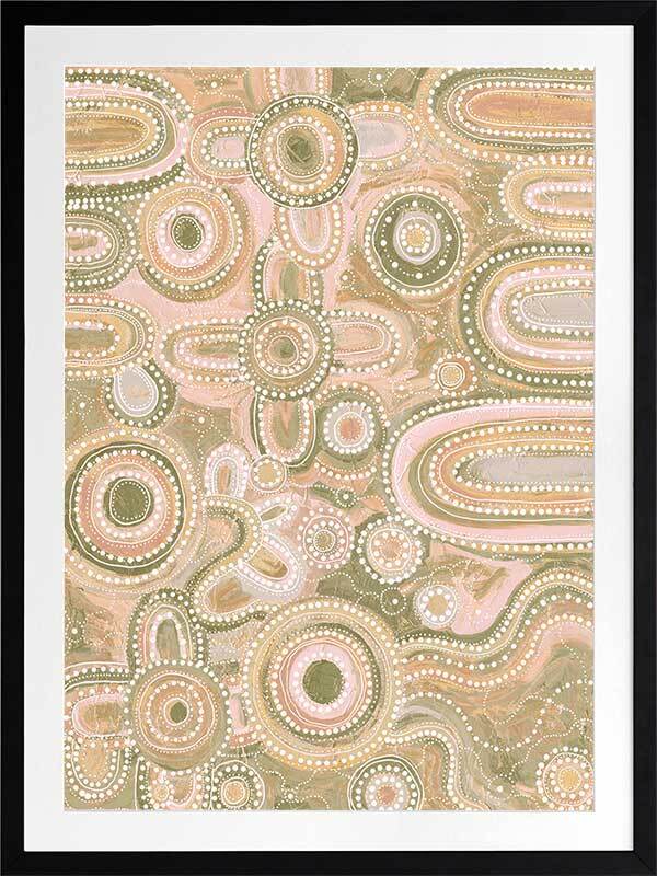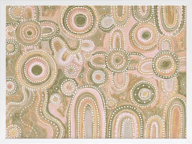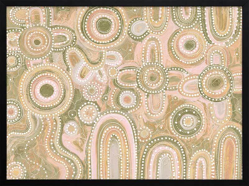 Yinaagang Multicolour Framed Art Print - Mesmerising in all its shapes and colours, this Aboriginal art piece by Wiradjuri artist, Amanda Hinkelmann, brings a dynamic, yet calming energy to any space. Overlapping round shapes and swirling lines are brought to life with traditional Indigenous dot painting, while a muted palette of blush and khaki green tones evokes a relaxing feel.