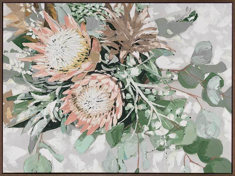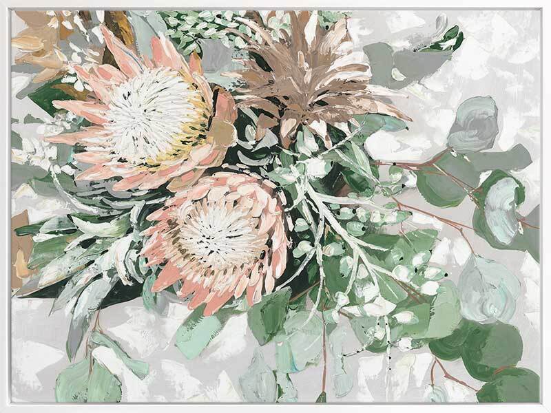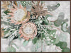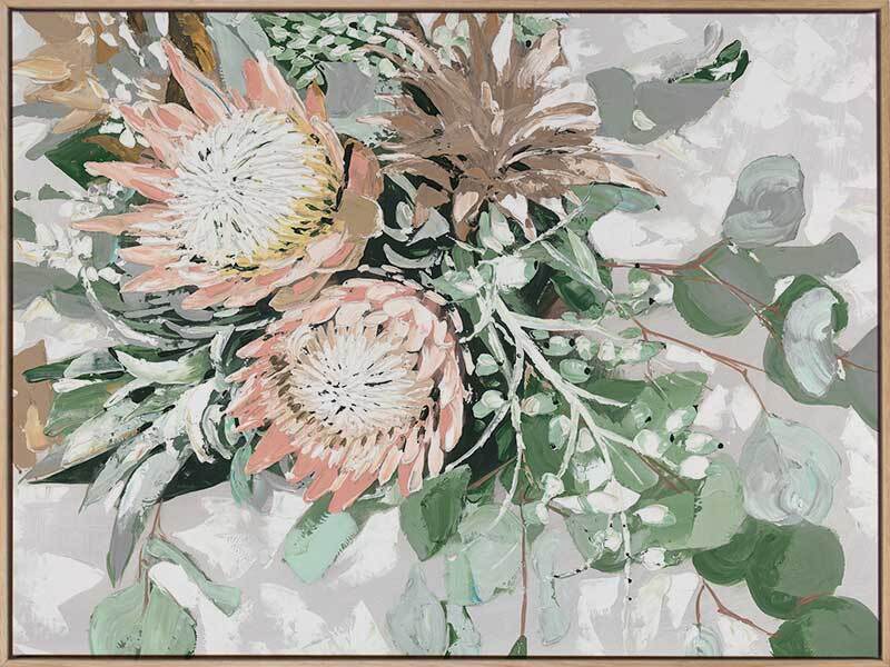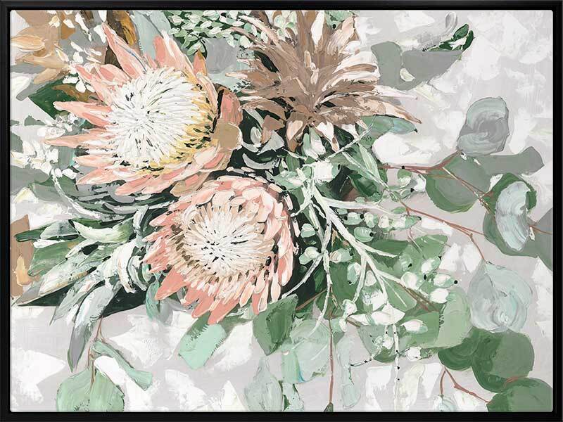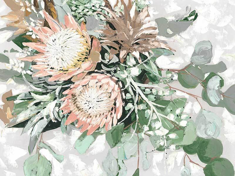 Your Majesty Canvas Art Print - A pastel-toned bouquet of pink proteas and native green foliage against a textured grey background.