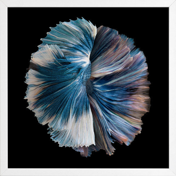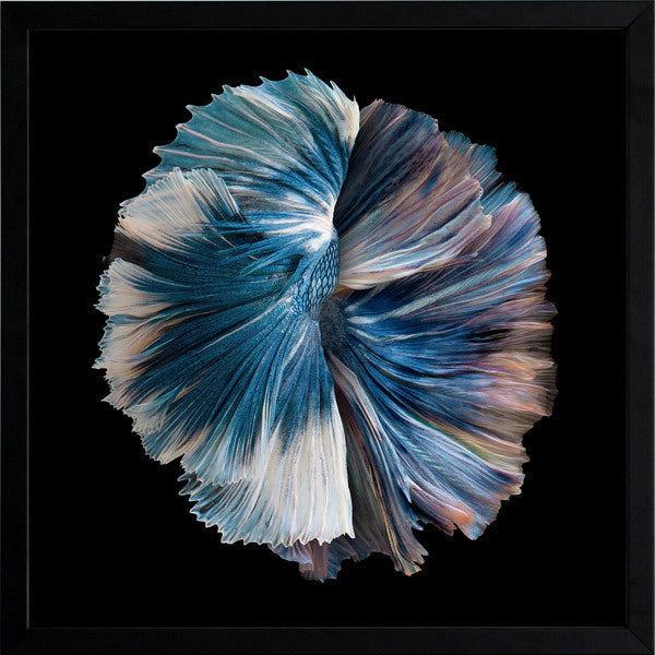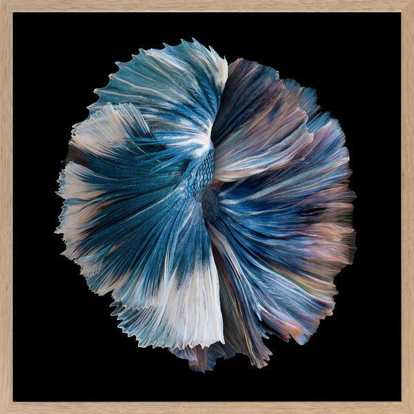 Zeta Framed Print: Two betta fish intertwine, their iridescent pink, cream, blue and purple tails fan out in a circle against a stark, black background. Pairs with Omega. 2019 AUTUMN/WINTER COLLECTION: ODYSSEY